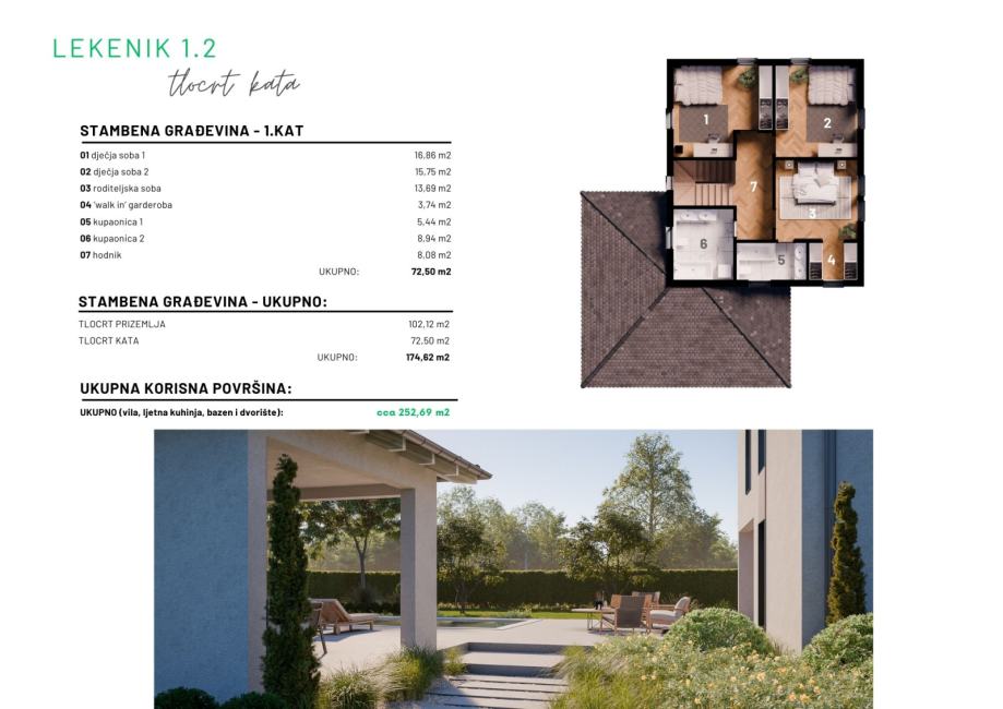 Lekenik 1.2. se ističe svojom dvokatnom strukturom i odličnom prostornom dispozicijom sadržaja. Vila je katnica sa dnevnim prostorom, garažom i natkrivenim parkirališnim mjestom u prizemlju te spavaćim djelom na katu. Prostrana kuhinja sa blagavaonicom i dnevnim boravkom su osmišljene kao open space prostor s izlazima na natkrivenu terasu i grijani bazen. Na prvom katu, tri spavaće sobe i dvije kupaonice nude svima potreban mir, udobnost i privatnost. U dvorištu se uz bazen nalazi vrhunski dizajnirana ljetna sjenica sa popratnim prostorijama koji će osigurati prostor za vrhunske zabave u okrilju vlastitog dvorišta.