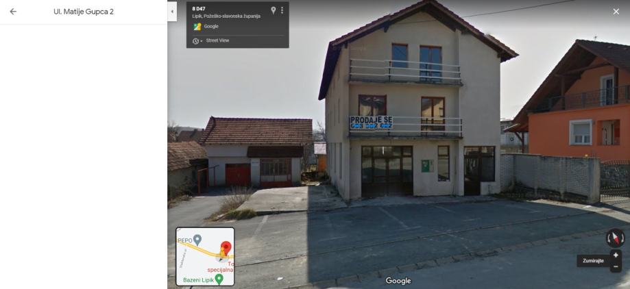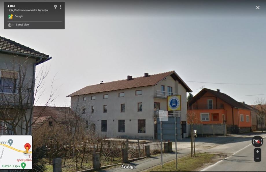 Troetažna poslovna zgrada plus podrum, sa dvije garaže na atraktivnoj lokaciji, 100 m od Lječilišta i centra Lipika,! Odmah do bazena. Stambenog prostora ima oko 640 m2 plus garaže .U prizemlju je iznamljen poslovni prostor.Imaju priključci, Papiri uredni bez tereta.Poslovna zgrada predviđena za hostel,restoran sa sobama,stanove. Mob 091 301 301 9