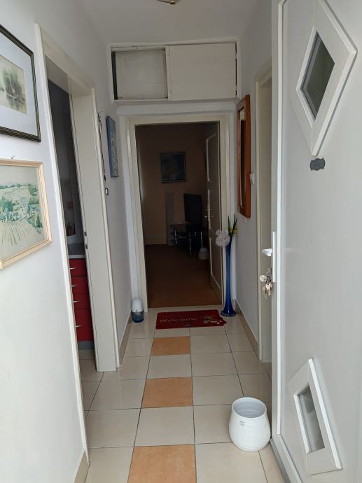 Ulazni hodnik, lijevo kuhinja ih koje se ulazi u kupaonicu sa WC-om i izlaz na tavan, desno u hodniku blagovaona, ravno dnevni boravak iz kojeg se ulazi u spavaću sobu.