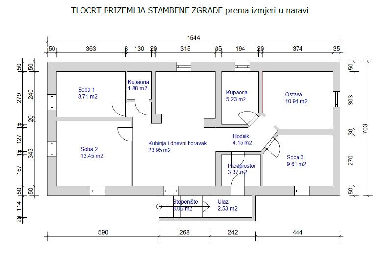 Stambena zgrada sagrađena je unutar vanjskih tlocrtnih dimenzija cca 15,44 x 7,03 m + 1,34 x 5,10 m, katnost: pod+priz.