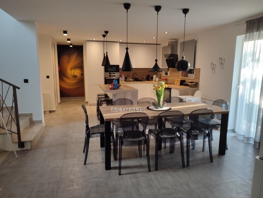Prodaje se luksuzno uređena vila u Malinskoj na otoku Krku stambene površine 250 m2, bazenom od 24 m2 i dvorištem 415 m2, smještena na mirnoj lokaciji okružena zelenilom, idealna za stanovanje ili iznajmljivanje turistima koji žele nesmetani mir i tišinu. Sastoji se od podrumske prostorije, prizemlja i kata. U podrumskoj prostoriji nalazi se jacuzi i infracrvena sauna te drugi sadržaji. U prizemlju su WC-kupaona, prostrana kuhinja i dnevni boravak, soba sa vlastitom WC-kupaonom, prostrani vešeraj. Na katu se nalaze tri sobe svaka sa vlastitom WC-kupaonom, iz dvije sobe moguć je izlaz na balkon sa kojeg se pruža odličan pogled na Malinsku i Kvarner.