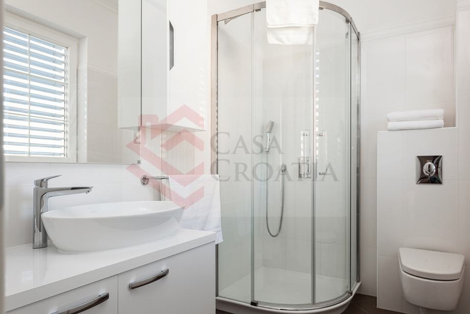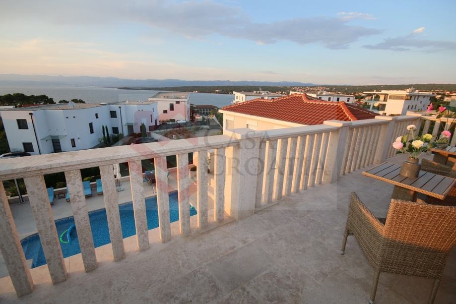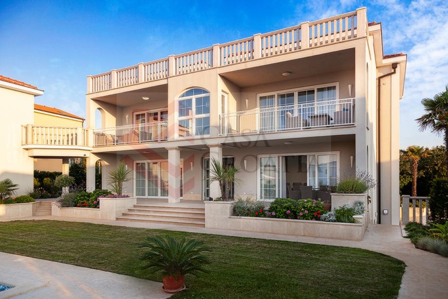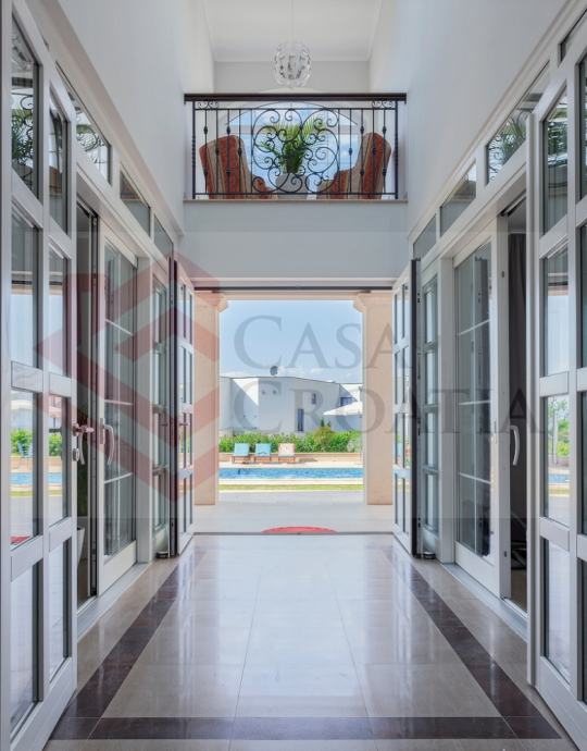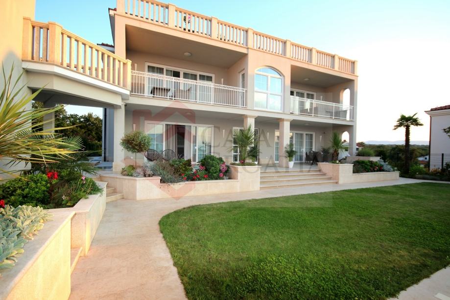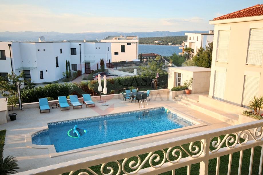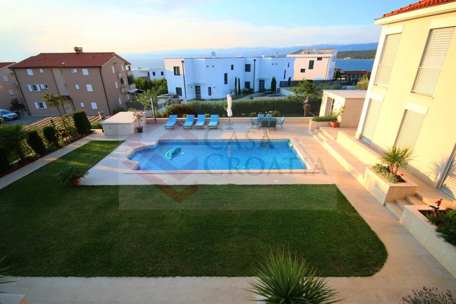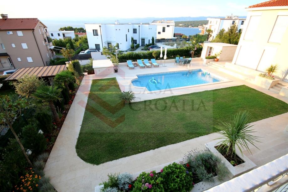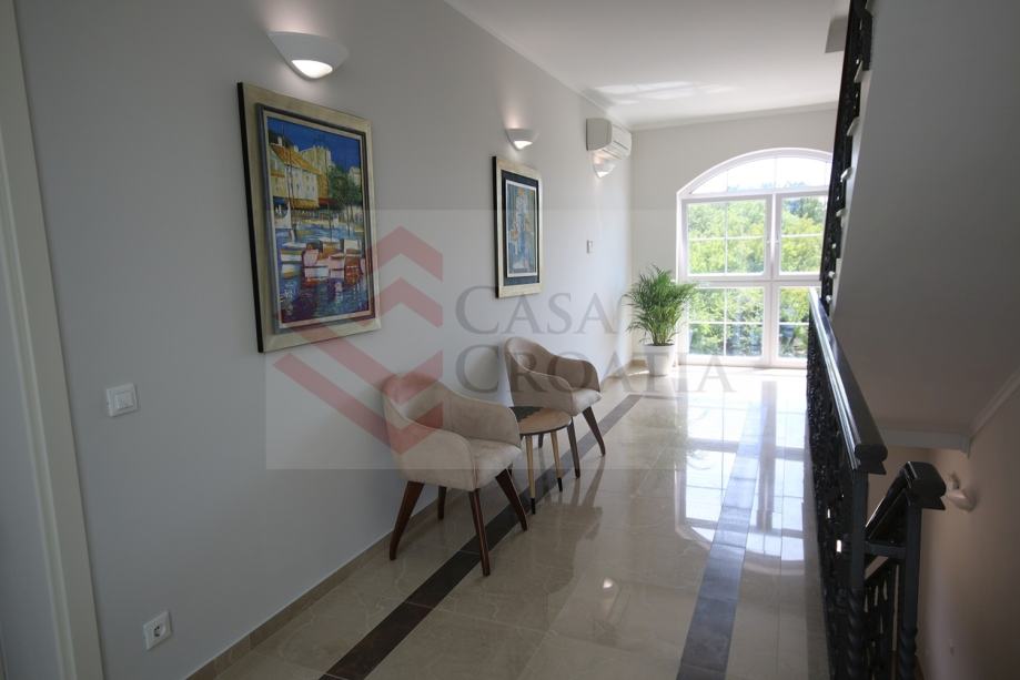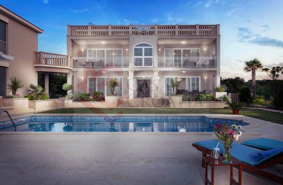 Prodaje se luksuzni kompleks u Rovi (Malinska) na otoku Krku 200 metara od mora (iznad Blue Wave Resorta).Sastoji se od velike i male kuće te bazena.Velika kuća ima površinu od 850 m2 raspoređenih na 4 etaže: - prizemlje: veliki dnevni boravak, zajednička blagovaonica, kuhinja, wc, terasa te tri sobe s kupaonicama s WC-om - kat: 2 apartmana po cca 95 m2 s dnevnim boravkom, kuhinjom, 2 spavaće sobe i dvije kupaonice s WC-om - potkrovlje: 2 apartmana po cca 70 m2 s dnevnim boravkom, kuhinjom, 2 spavaće sobe i dvije kupaonice s WC-om - podrum: garaža u razini ceste od 45 m2 za dva automobila ili brod; prostor od 60 m2 koji uključuje peglaonicu, strojarnicu i kupaonicu; konoba od 100 m2; wellness od 30 m2Mala kuća ima površinu od 100 m2 raspoređenih na 2 etaže: - prizemlje: apartman od 50 m2 s dnevnim boravkom, kuhinjom, spavaćom sobom i kupaonicom s WC-om - kat: apartman od 50 m2 s dnevnim boravkom, kuhinjom, spavaćom sobom i kupaonicom s WC-omBazen: zaštićen od pogleda, površine 50 m2, nabavljena sva potrebna oprema uključujući i protustrujno plivanje.Zemljište ima izlaz na 2 ceste i njegova ukupna površina iznosi 1.400 m2.Oprema: - stolarija drvo/aluminij proizvođača Stabil (Austrija) - žaluzine na struju (osim u maloj kući) - krovni prozori na struju Velux (potkrovlje velike kuće) - klima proizvođača Daikin (Japan): u velikoj kući 1 vanjska jedinica i 29 unutarnjih + u maloj kući 1 vanjska jedinica i 4 unutarnje - krovište: crijep Tondach – Mediteran - termo fasada - 2 rezervoara za toplu vodu od po 300 litara svaki - u kupaonicama podno grijanje na struju - hrastov parket u spavaćim sobama - keramika u kupaonicama proizvođača Improntaceramiche - Italgranitigroup (Italija)