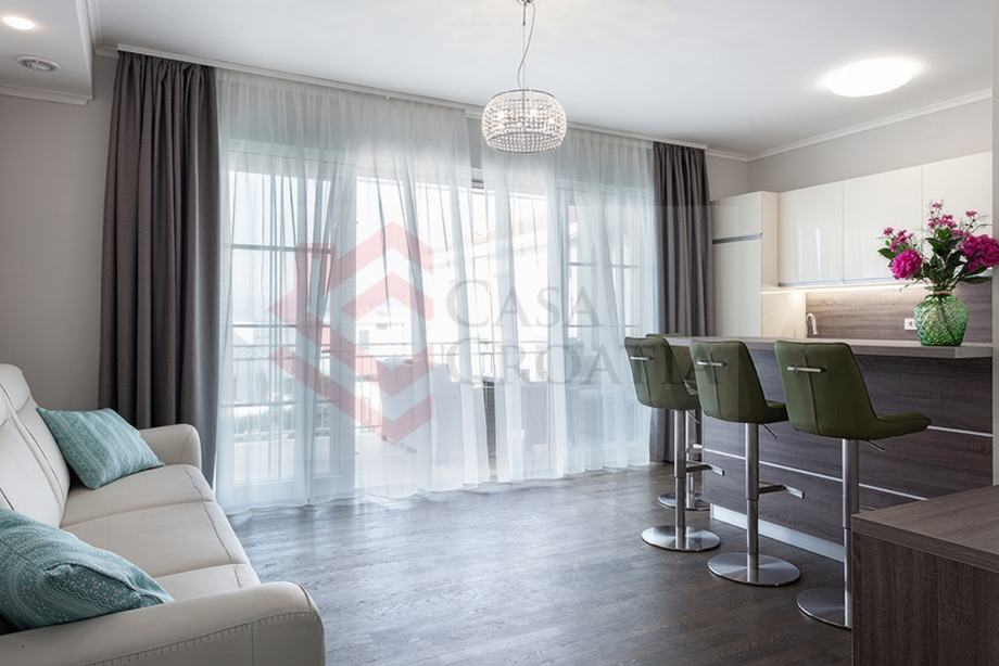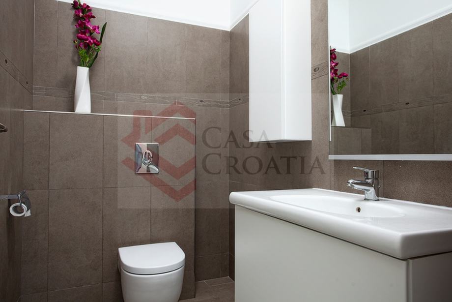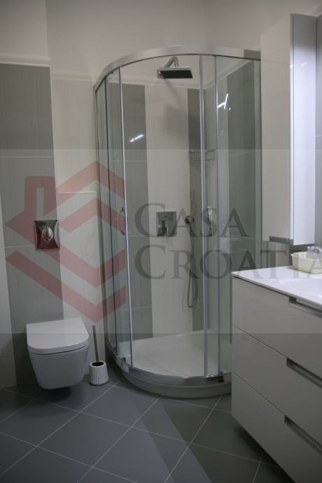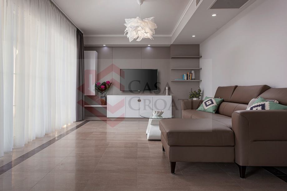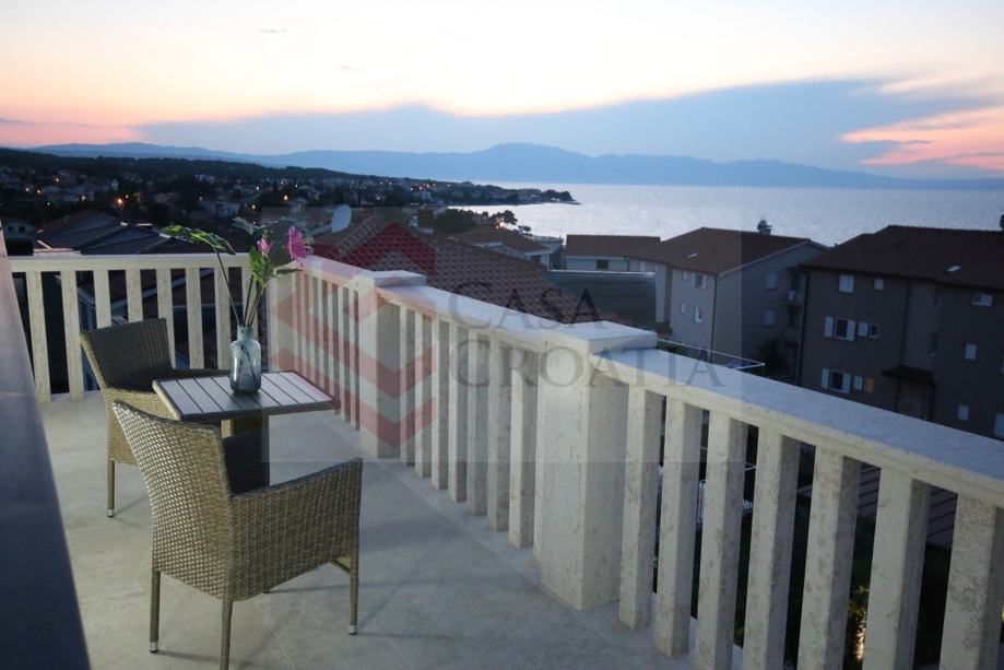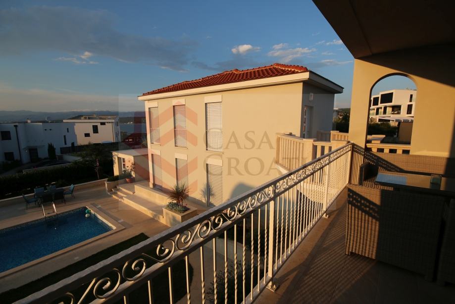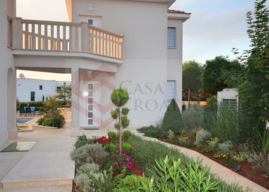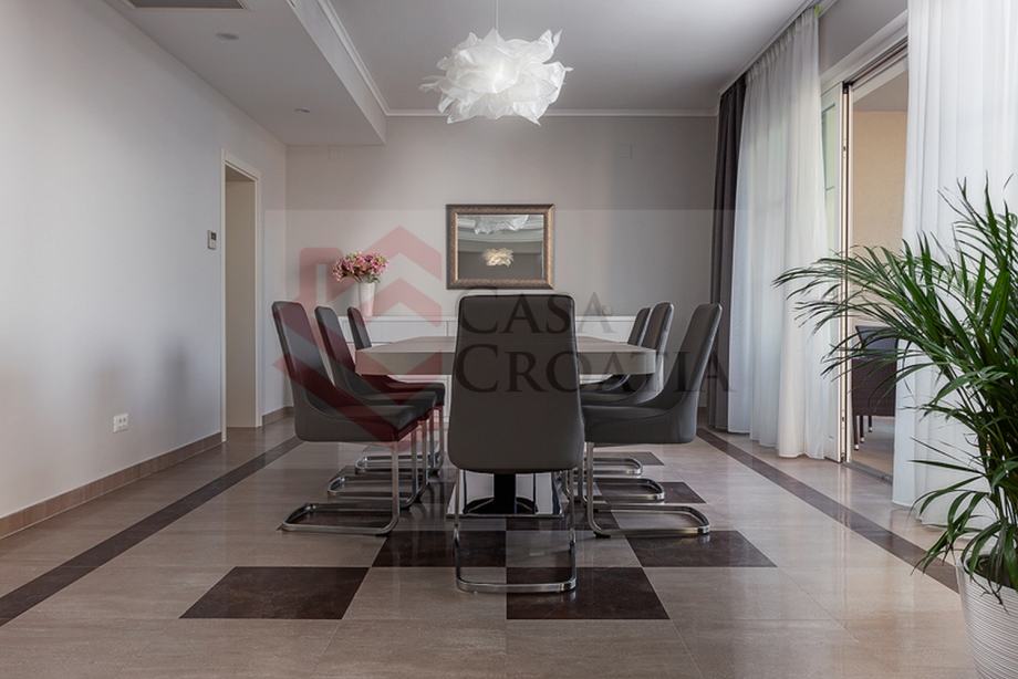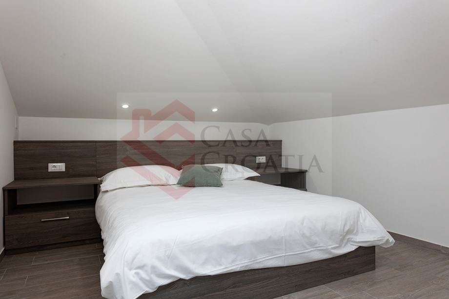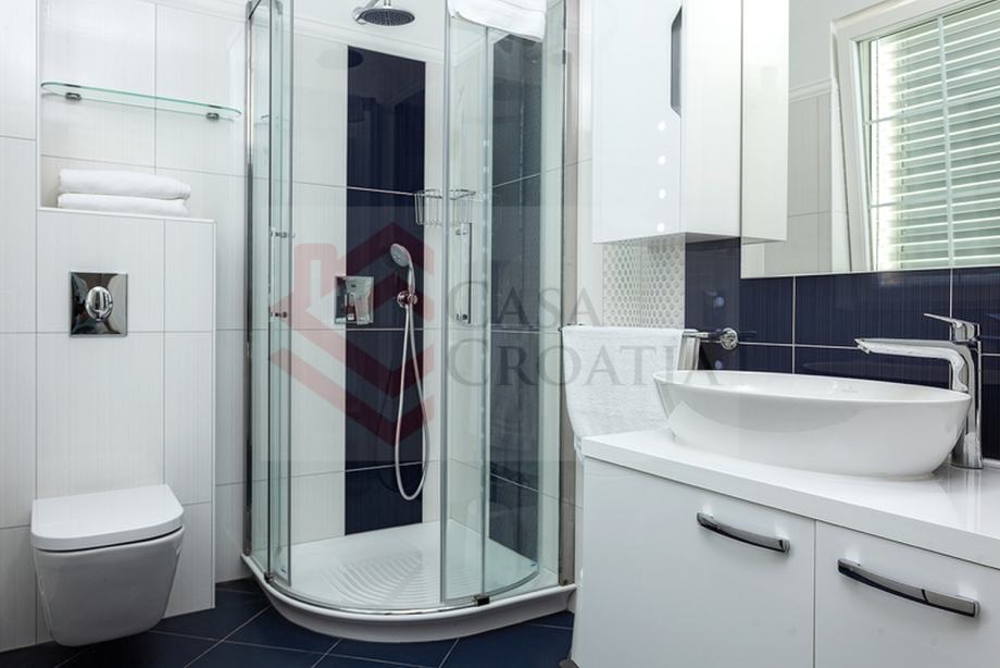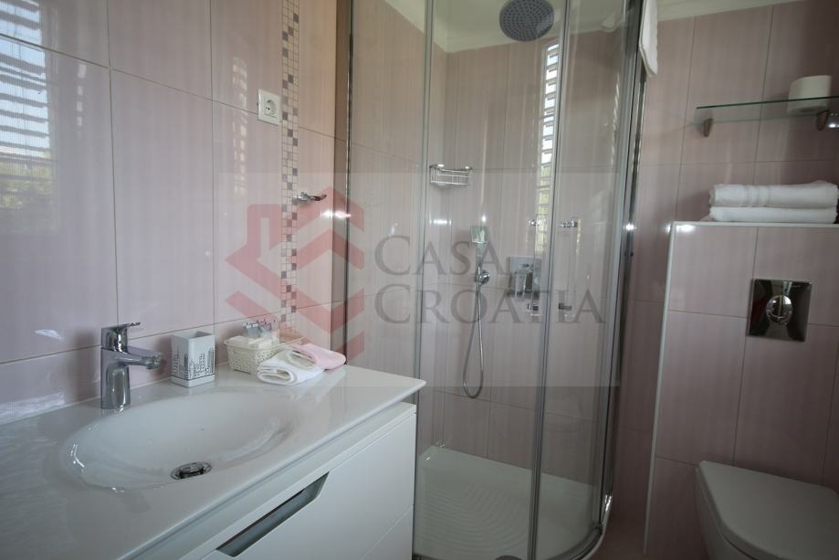 Prodaje se luksuzni kompleks u Rovi (Malinska) na otoku Krku 200 metara od mora (iznad Blue Wave Resorta).Sastoji se od velike i male kuće te bazena.Velika kuća ima površinu od 850 m2 raspoređenih na 4 etaže: - prizemlje: veliki dnevni boravak, zajednička blagovaonica, kuhinja, wc, terasa te tri sobe s kupaonicama s WC-om - kat: 2 apartmana po cca 95 m2 s dnevnim boravkom, kuhinjom, 2 spavaće sobe i dvije kupaonice s WC-om - potkrovlje: 2 apartmana po cca 70 m2 s dnevnim boravkom, kuhinjom, 2 spavaće sobe i dvije kupaonice s WC-om - podrum: garaža u razini ceste od 45 m2 za dva automobila ili brod; prostor od 60 m2 koji uključuje peglaonicu, strojarnicu i kupaonicu; konoba od 100 m2; wellness od 30 m2Mala kuća ima površinu od 100 m2 raspoređenih na 2 etaže: - prizemlje: apartman od 50 m2 s dnevnim boravkom, kuhinjom, spavaćom sobom i kupaonicom s WC-om - kat: apartman od 50 m2 s dnevnim boravkom, kuhinjom, spavaćom sobom i kupaonicom s WC-omBazen: zaštićen od pogleda, površine 50 m2, nabavljena sva potrebna oprema uključujući i protustrujno plivanje.Zemljište ima izlaz na 2 ceste i njegova ukupna površina iznosi 1.400 m2.Oprema: - stolarija drvo/aluminij proizvođača Stabil (Austrija) - žaluzine na struju (osim u maloj kući) - krovni prozori na struju Velux (potkrovlje velike kuće) - klima proizvođača Daikin (Japan): u velikoj kući 1 vanjska jedinica i 29 unutarnjih + u maloj kući 1 vanjska jedinica i 4 unutarnje - krovište: crijep Tondach – Mediteran - termo fasada - 2 rezervoara za toplu vodu od po 300 litara svaki - u kupaonicama podno grijanje na struju - hrastov parket u spavaćim sobama - keramika u kupaonicama proizvođača Improntaceramiche - Italgranitigroup (Italija)