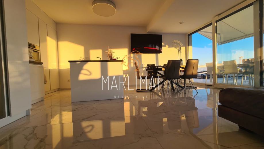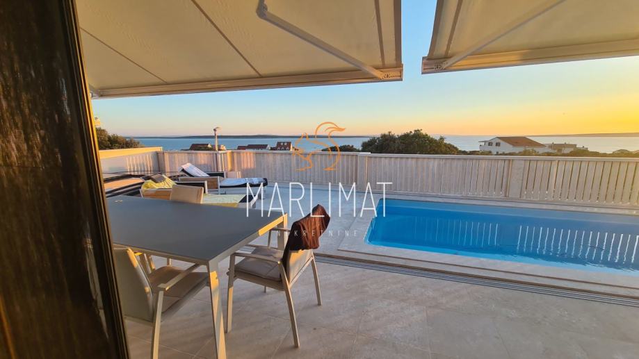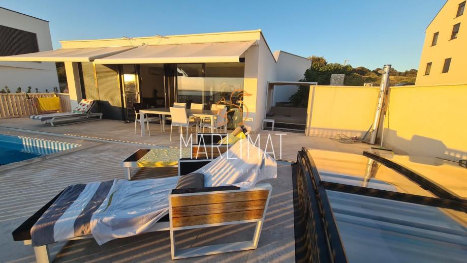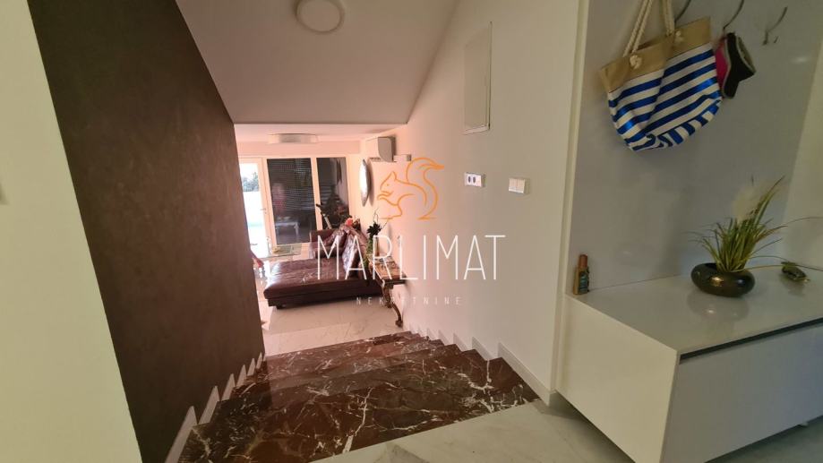 Na parceli od 653m2 prodaje se samostojeća kuća s bazenom veličine 120m2 iz koje se pruža lijep pogled na more koje je udaljeno svega 350 metara od kuće.