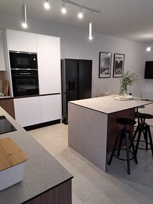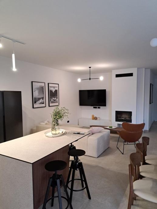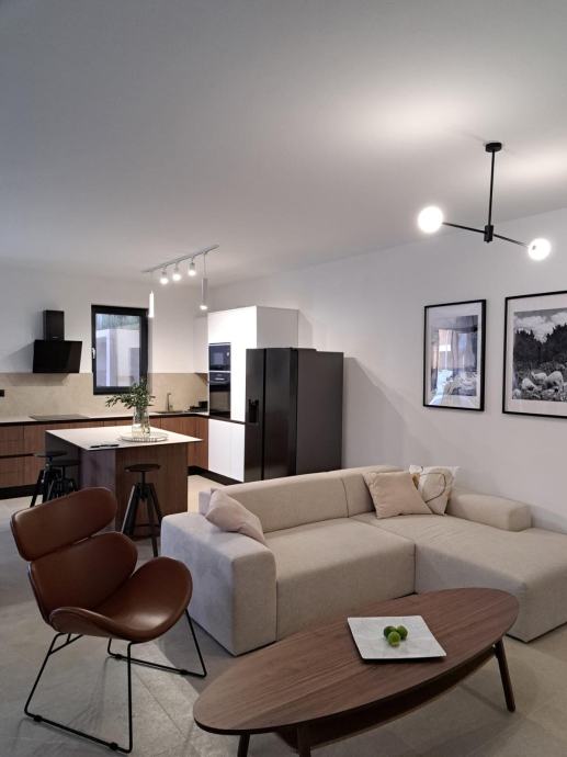 Ovaj poluuklopljeni objekt nudi 220 m² stambenog prostora, upotpunjenog uređenim dvorištem, bazenom i dodatnim sadržajima. Izgrađena je od visokokvalitetne opeke i armirano-betonske konstrukcije, s ravnim krovom koji ima vrhunsku hidro i termoizolaciju. Detalji od prirodnog kamena na fasadi dodatno naglašavaju sofisticirani dizajn.