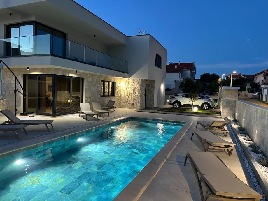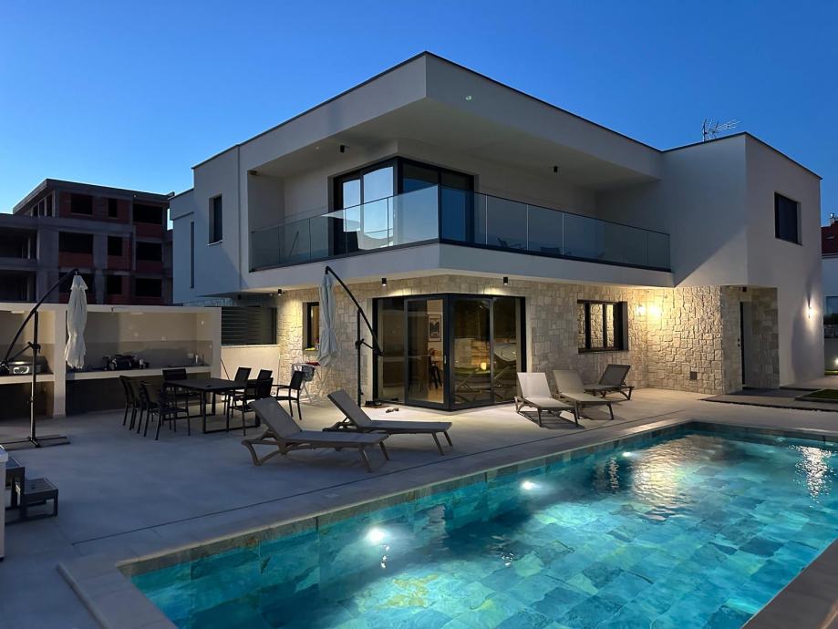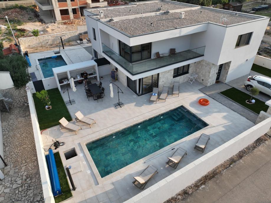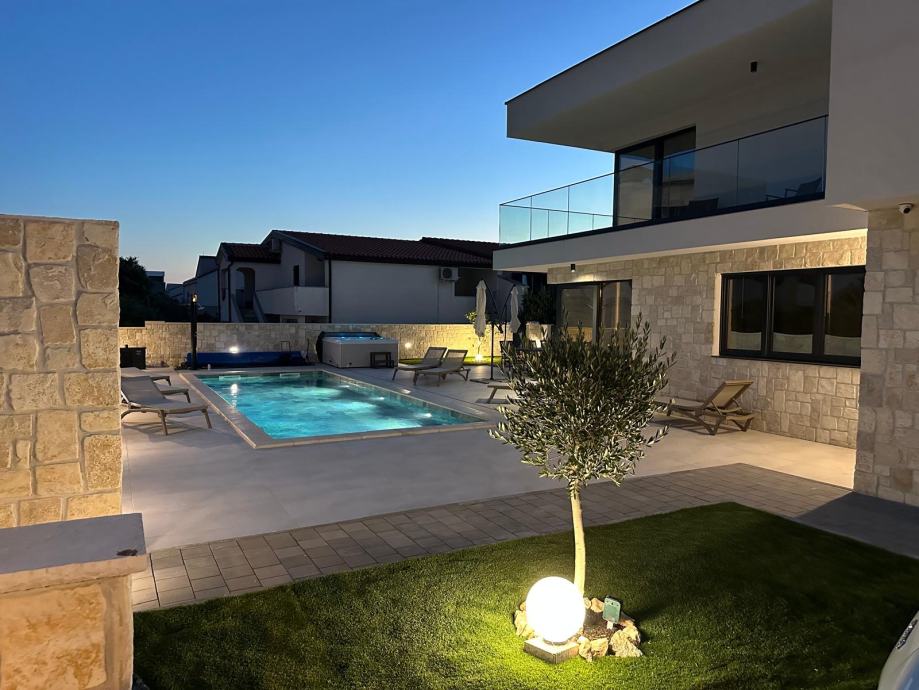 Vanjski prostor pruža potpunu privatnost i opuštanje. U dvorištu se nalazi bazen s keramičkim pločicama, opremljen automatskim sustavom održavanja i dizalicom topline. Ljetna kuhinja s roštiljem, sudoperom i indukcijskim pločama savršena je za druženja na otvorenom, uz bio pergolu od 20 m² i solarni vanjski tuš. Jacuzzi, ambijentalna rasvjeta i priprema za solarne panele dodatno unapređuju luksuzne sadržaje.