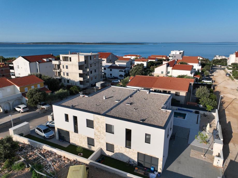 PARTHENON nekretnine posreduju u prodaji vrhunske moderne vile smještene u Mandrama, prekrasnom planski građenom urbanom naselju na otoku Pagu. Mandre su poznate po svojoj mirnoj atmosferi, uređenim ulicama i blizini mora, a ova vila idealno se uklapa u taj sklad. Vila je udaljena svega 380 metara pješice od kristalno čistog mora, što je čini savršenim izborom za one koji traže spoj luksuza i prirode.
