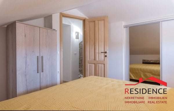 Na prvom katu se nalaze dvije spavaće sobe svaka sa svojim kupatilom i u mansardi dvije spavaće sobe. Svaka soba ima klimu. Instalacije za centralno grijanje i solarno. Ukupna kvadratura 114 m2.