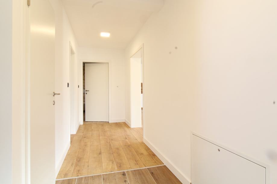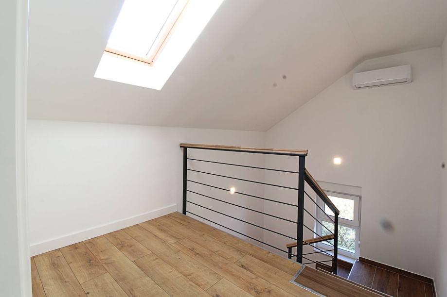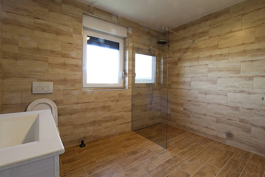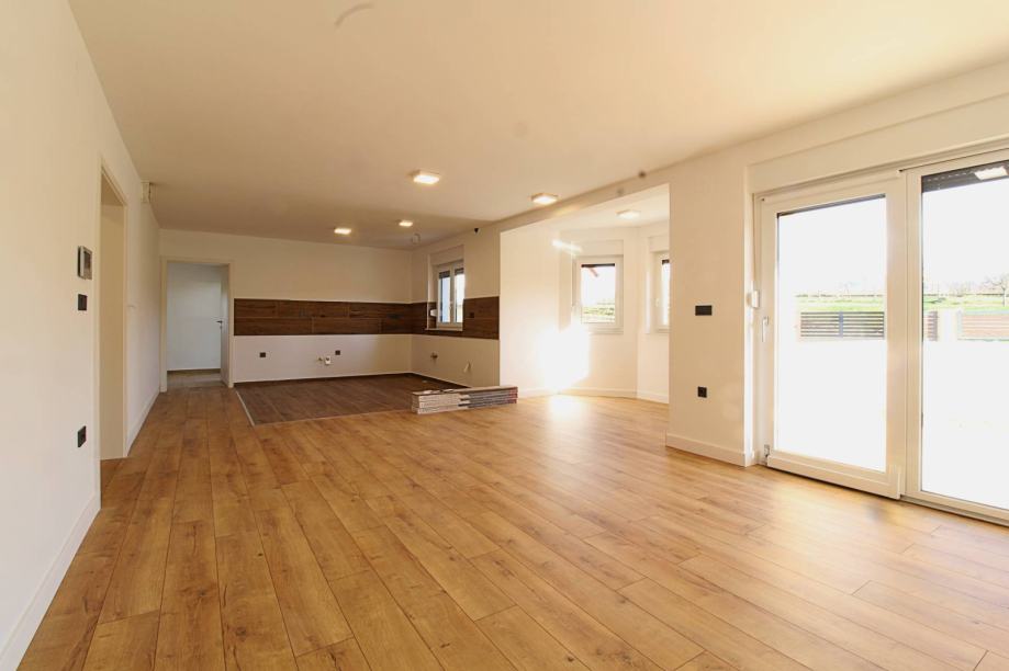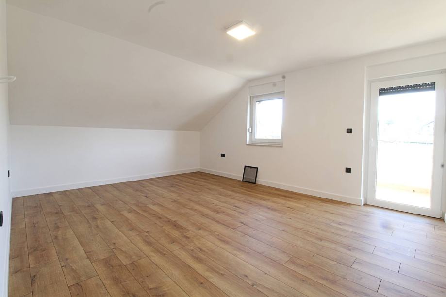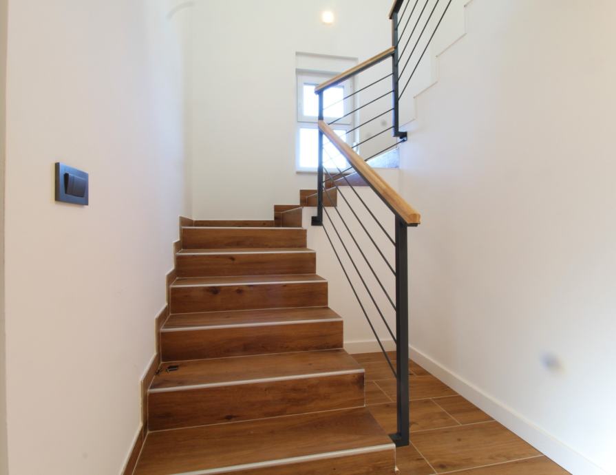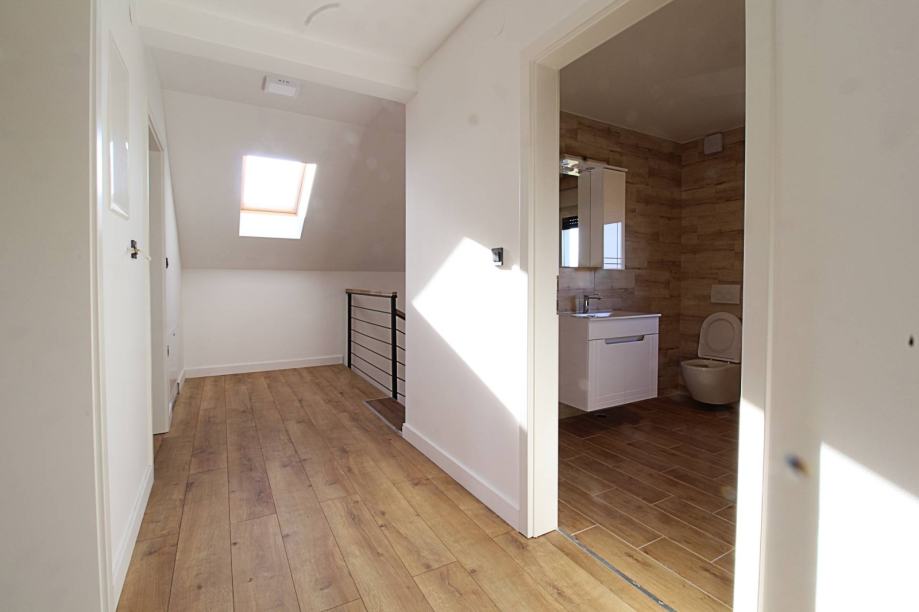 U prizemlju vam se nalazi ulazni hodnik, jedna manja soba, veliki dnevni boravak s kuhinjom te izlazom na terasu, velika prostrana kupaonica s tuš kadom i kadom, tehinčka soba i ostava, dok vam se na katu nalaze tri spavaće sobe od kojih dvije imaju izlaz na balkon te kupaonica.