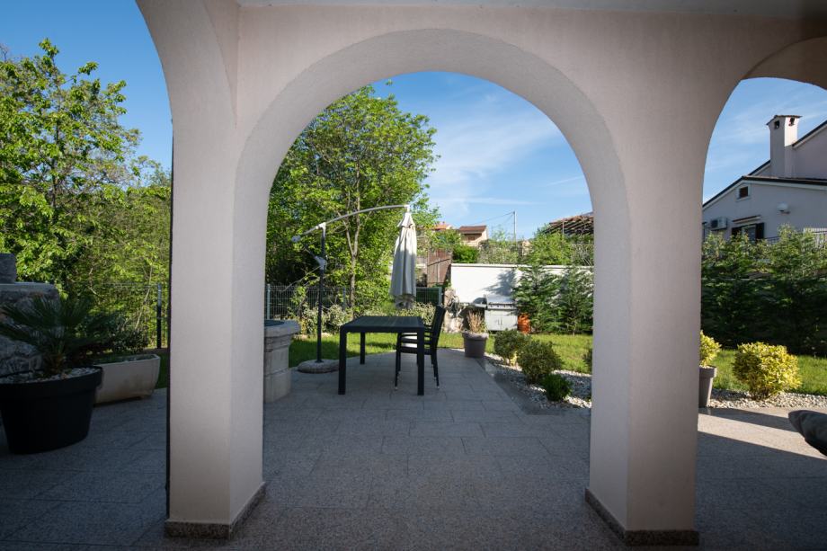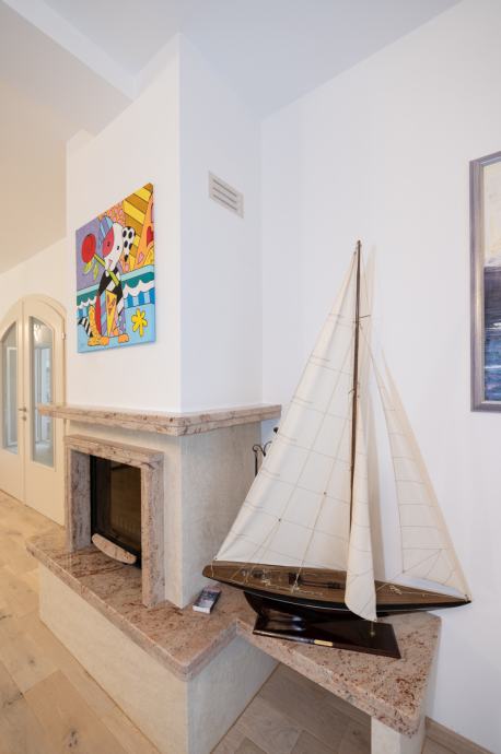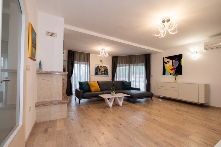 U prizemlju i na 1. katu je jedan dvoetažni stan sa stubištem, wc-om i dvije luksuzne sobe sa luksuznim kupaonicama i pripadajućim terasama, dnevnim boravkom, kuhinjom, blagavaonicom, ostavom, sa pripadajućom terasama sa roštiljem, kaminom, pečenjarom i bazenom.