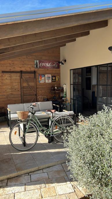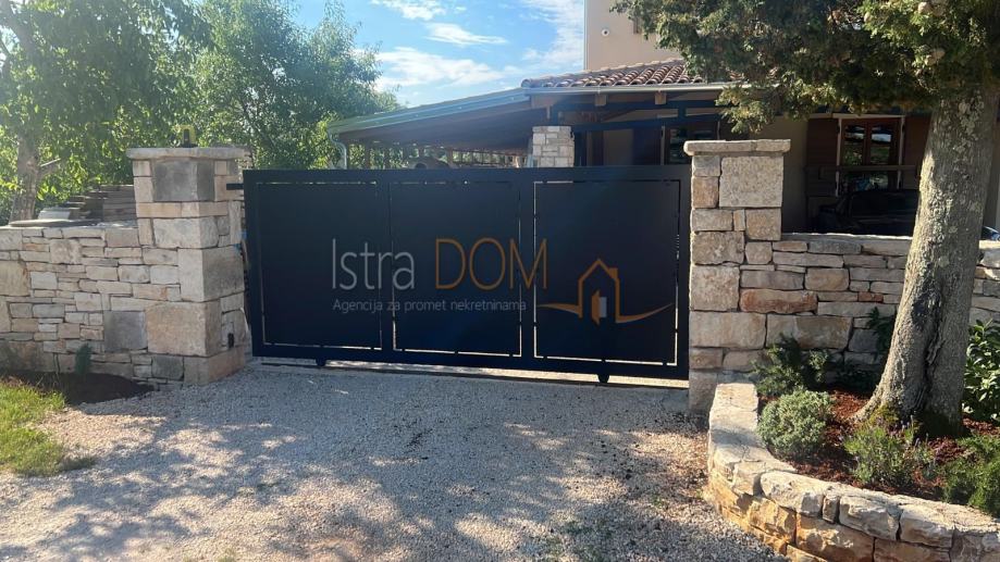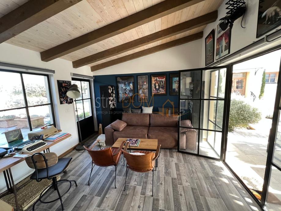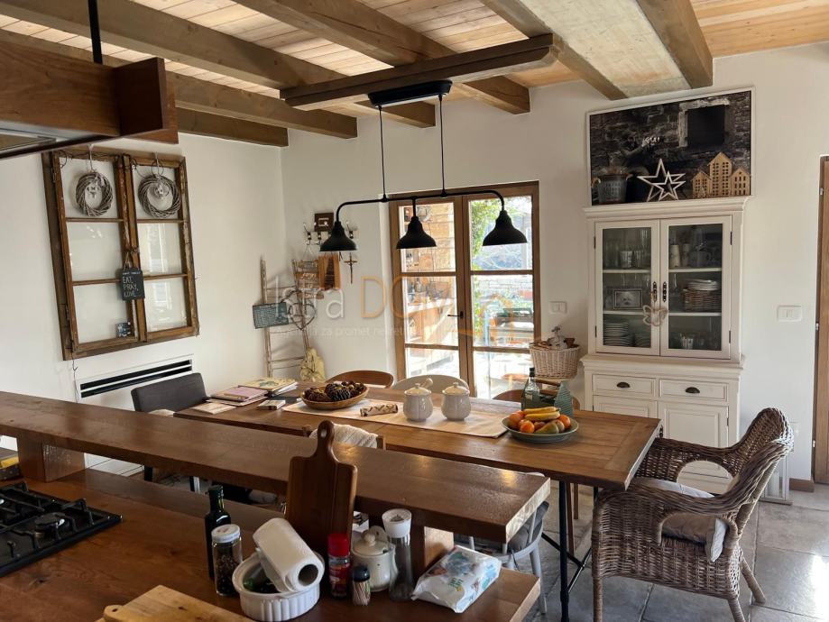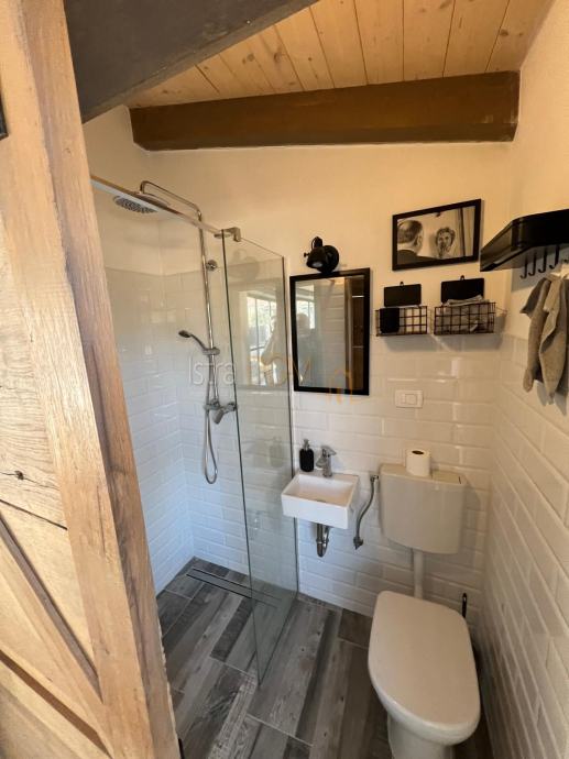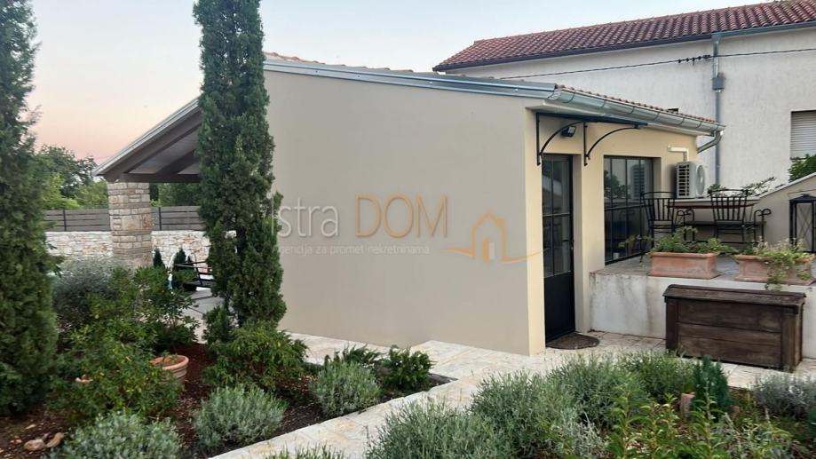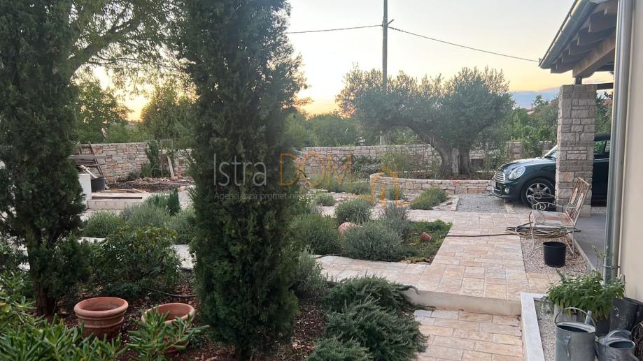 Okućnica je pažljivo uređena i okružena mediteranskim biljem, pružajući savršeno okruženje za opuštanje i uživanje u prirodi. Dodatno, uz kuću se nalazi pomoćni objekt od 23 m², opremljen kupaonicom i terasom, koji može poslužiti kao gostinjska soba ili prostor za rekreaciju.
