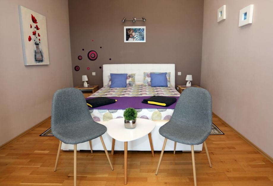 Sa jedne strane nalazi se odvojeno, jedna velika spavaća soba, sa vlastitom kupaonom sa kadom, sa vlastitim izlazom na veliku terasu.