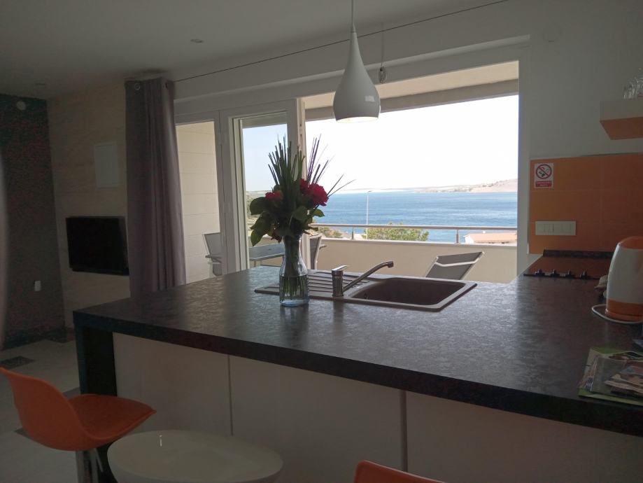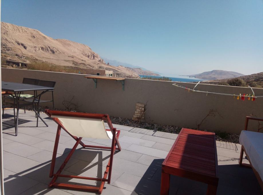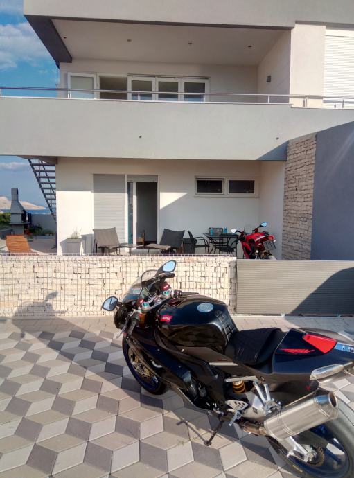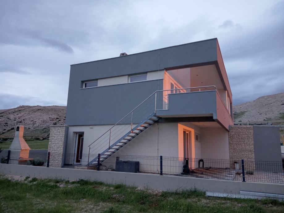Kuća je moderne i nove gradnje što joj daje poseban dojam. Vanjsko stubište vodi do prekrasne terase na katu kuće s nevjerojatnim panoramskim pogledom na Metajnu i paški zaljev.