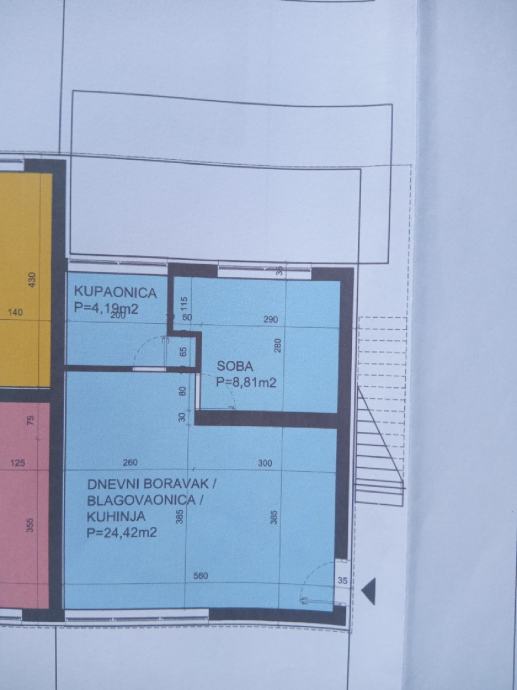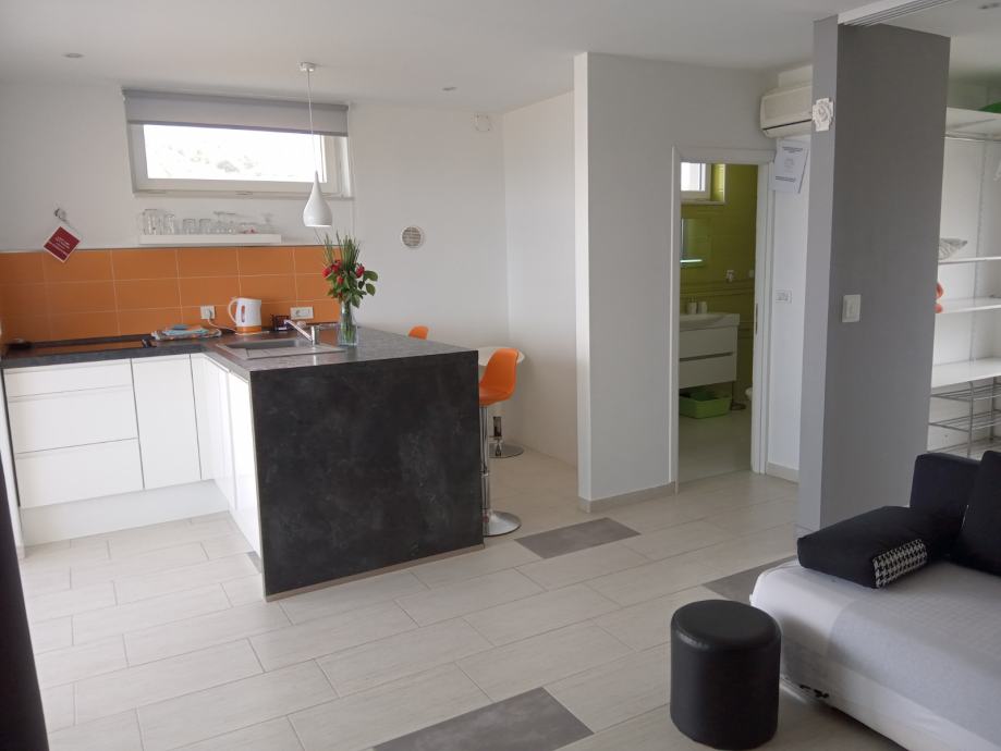 U prizemlju kuće nalazi se apartaman sa dvije terase, natkrivenom i nenatkrivenom. Apartman se sastoji od kuhinje s blagovaonicom, dnevnog boravka, spavaće sobe i kupaonice.