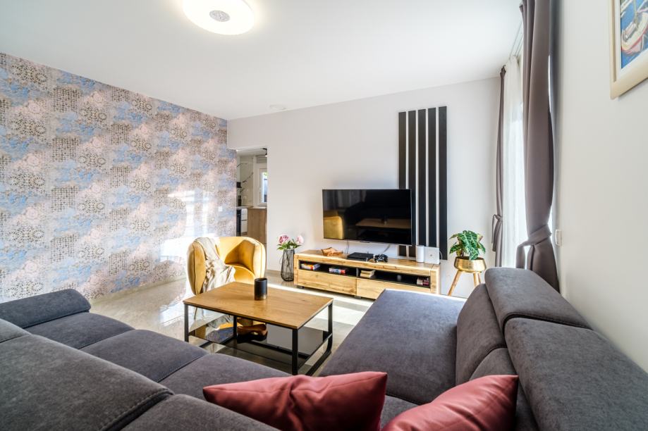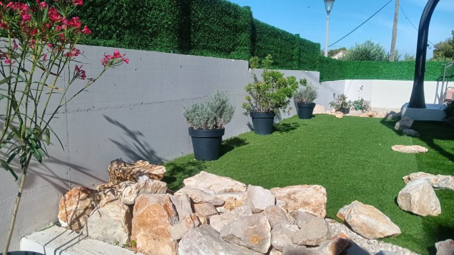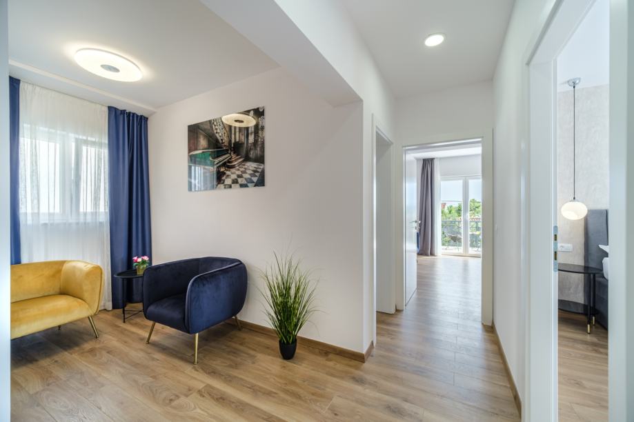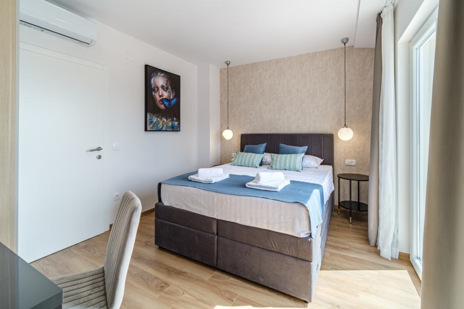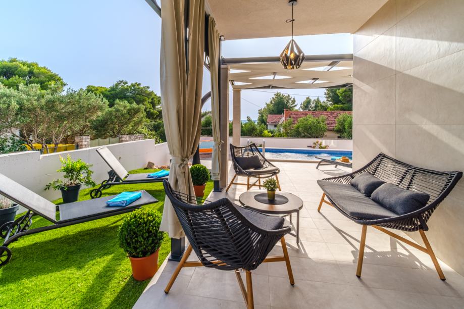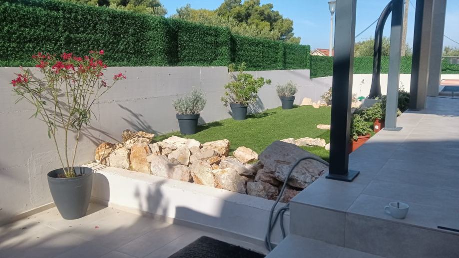 - Na prvom katu nalazi se zajednicki prostor za opuštanje, tri spavaće sobe s vlastitom kupaonicom i vlastitom terasom te vešerajem kompletno opremljenom.Na terasi su ležaljke . Ukratko, sve što je potrebito