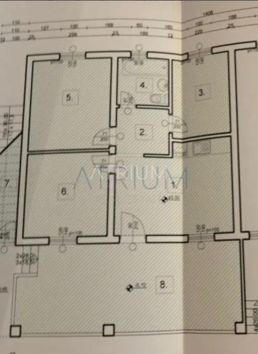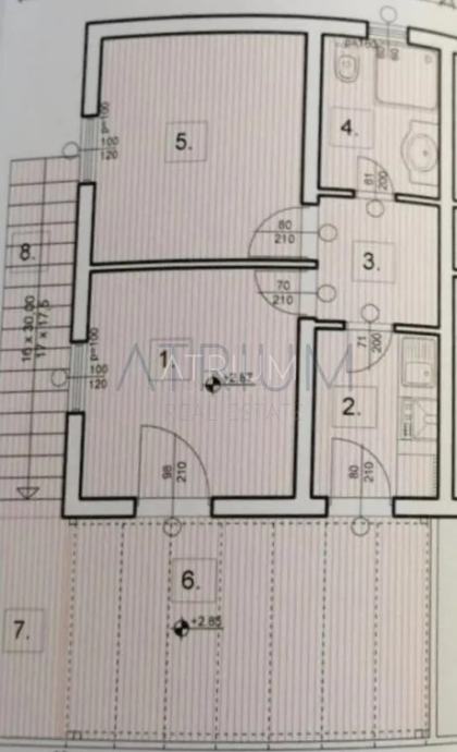 U prizemlju se nalazi trosoban stan s kuhinjom, blagovaonicom, kupatilom i terasom ukupne površine 77m2.