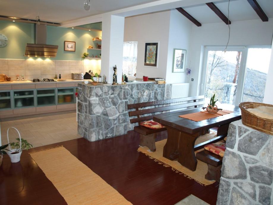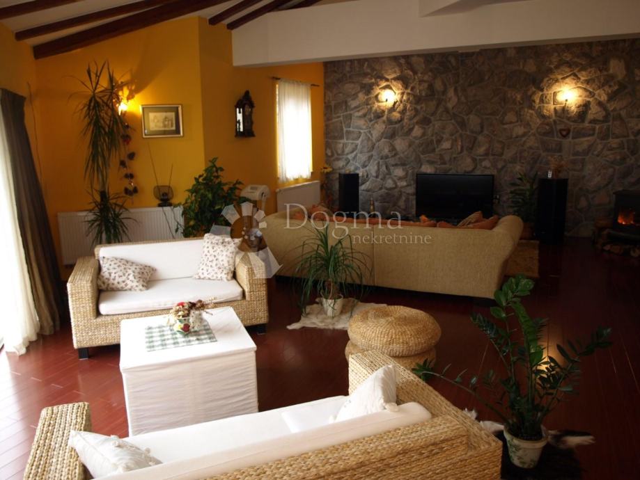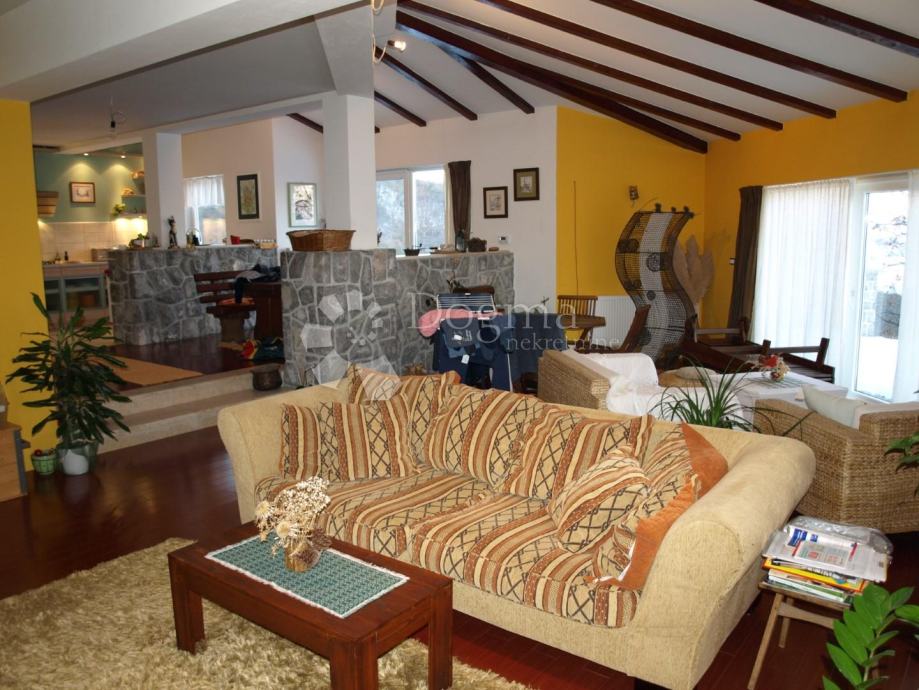Dnevni boravak na prvoj etaži povezan sa kuhinjom i blagovaonom kao open space prostor i nastavlja se na veliku terasu s prekrasnim pogledom.