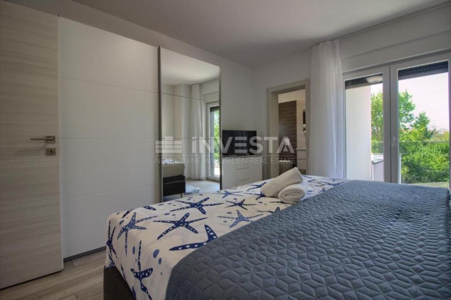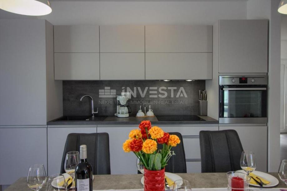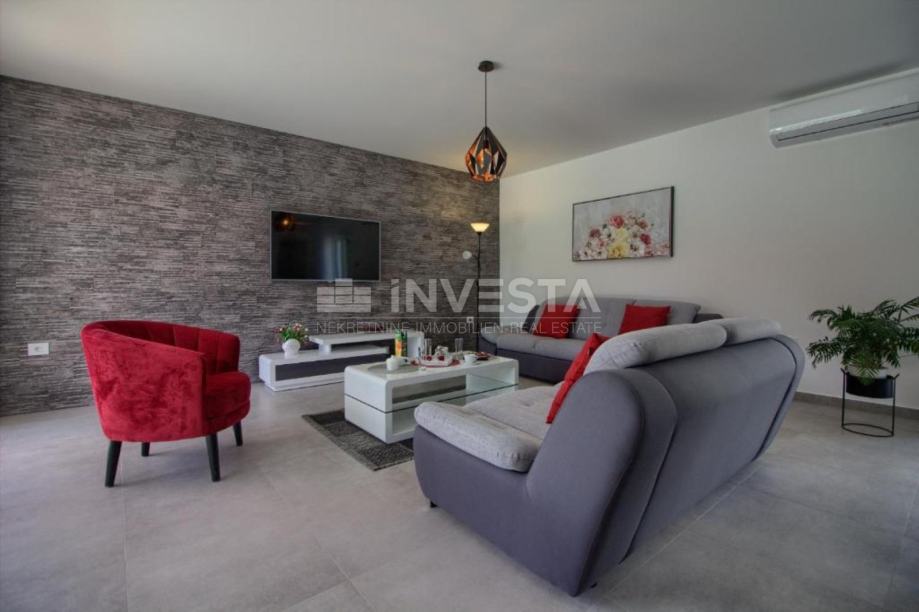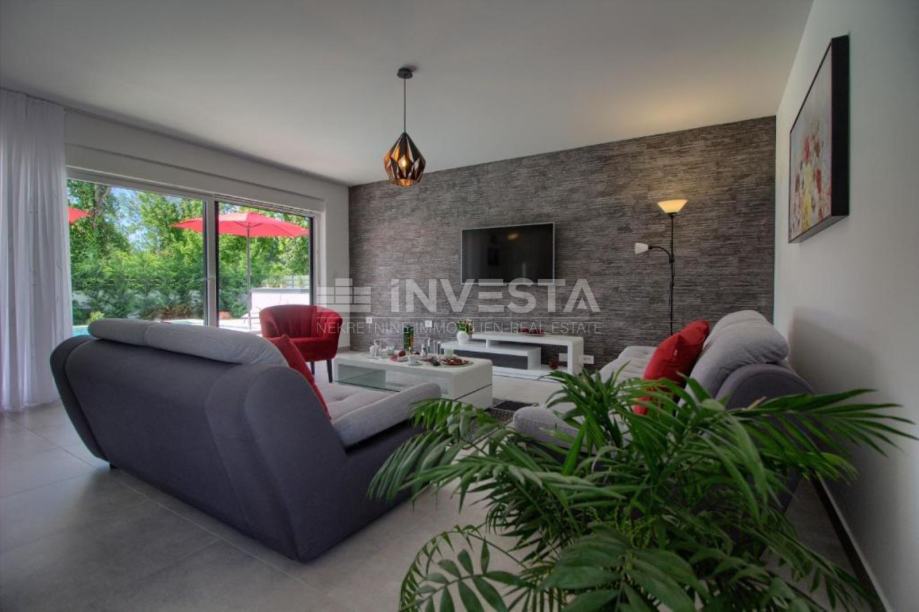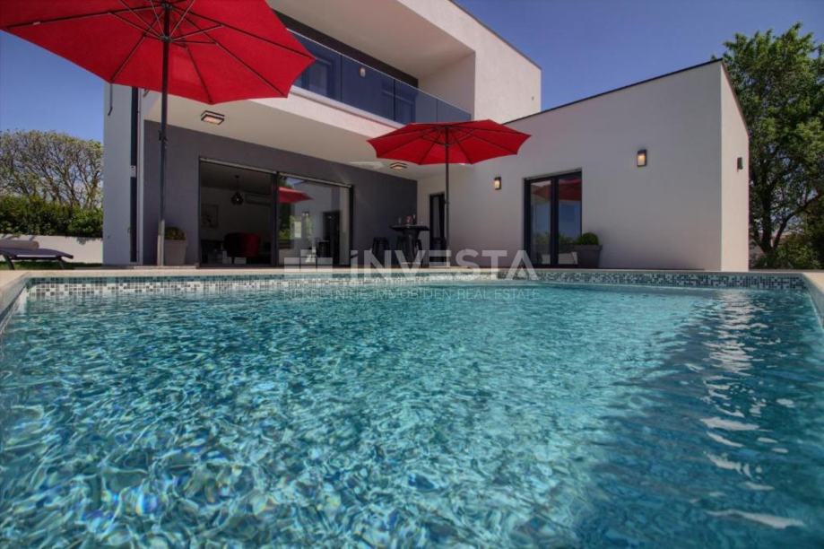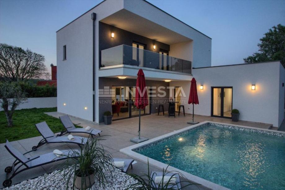 Na prodaju prekrasna kuća za odmor modernog dizajna u okolici Pule. Površina kuća je 145 m². Kuća se prostire na 2 etaže, gdje se u prizemlju nalazi opremljena kuhinja s blagovaonicom, dnevni boravak s direktnim izlaskom na vanjsku terasu, 1 spavaća soba s pripadajućom kupaonom i gostinjskim WC. Unutarnjim stepenicama dolazi se do 1. kata, gdje se nalaze, 2 spavaće sobe s izlazima na terase, svaka sa svojom pripadajućom kupaonom. Kuća je opremljena podnim grijanjem s dizalicom topline i klima uređajima u svakoj sobi, te u dnevnom boravku.
