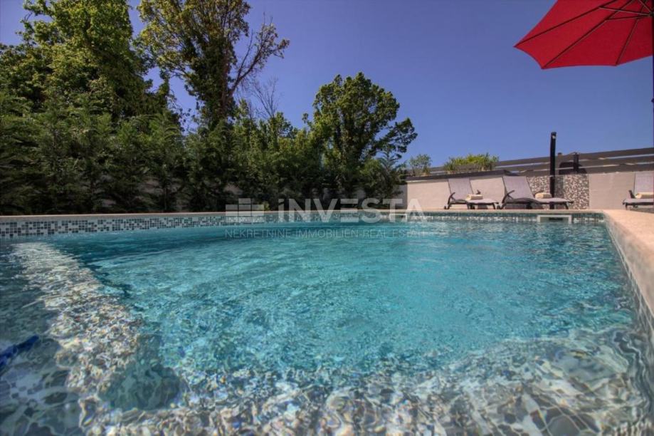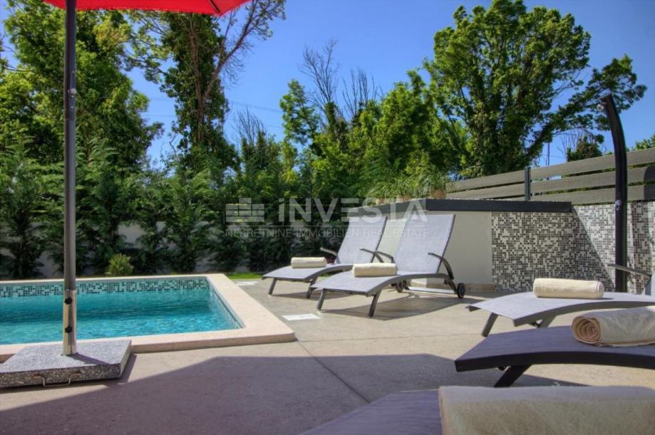 Okućnica je ograđena i uređena, s osiguranim parkingom za tri automobila. Središnji dio okućnice čini predivan bazen od 29 m² s sunčalištem, te vanjska igraonica za djecu.