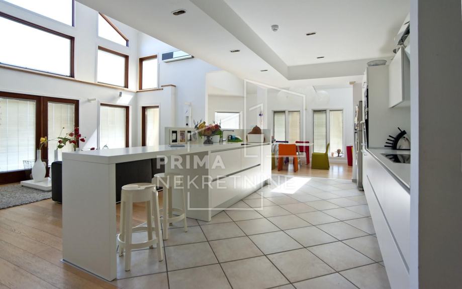 - prizemne etaže površine 144.38 m2, u kojoj se nalazi veliki atrij gdje je smješten dnevni boravak, povezan s kuhinjom i blagovaonicom otvorenog koncepta, soba, WC i gospodarski prostor s kotlovnicom i spremištem.