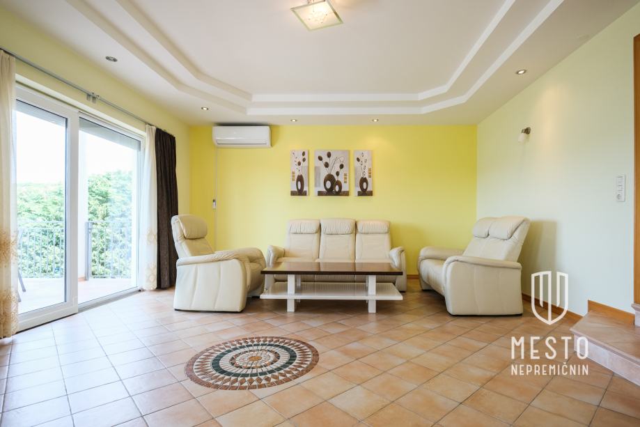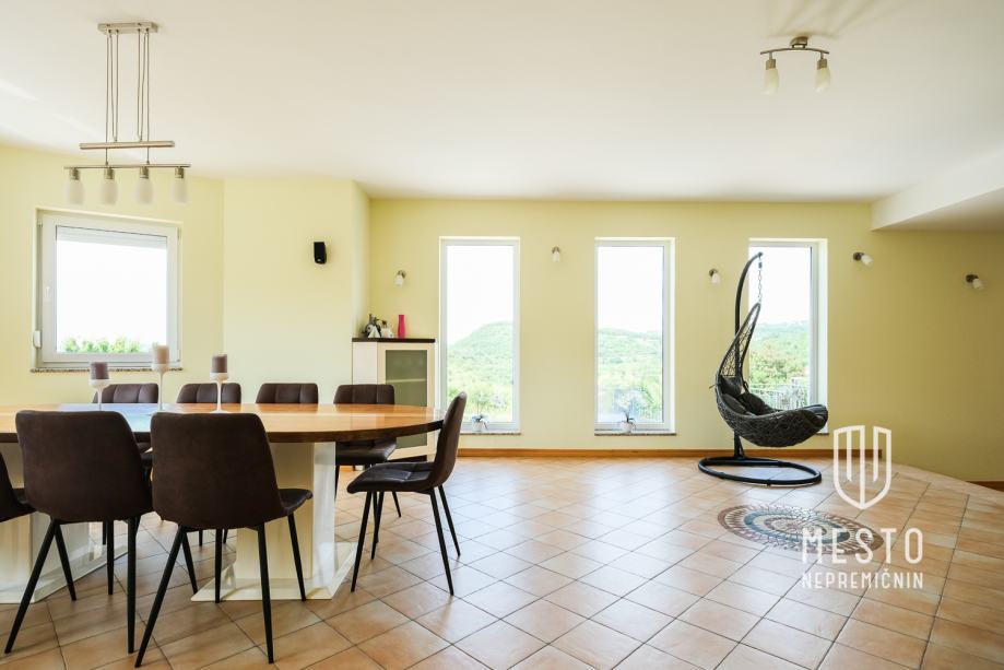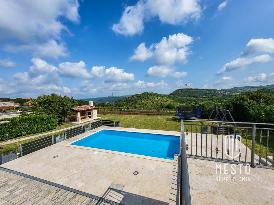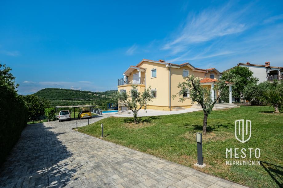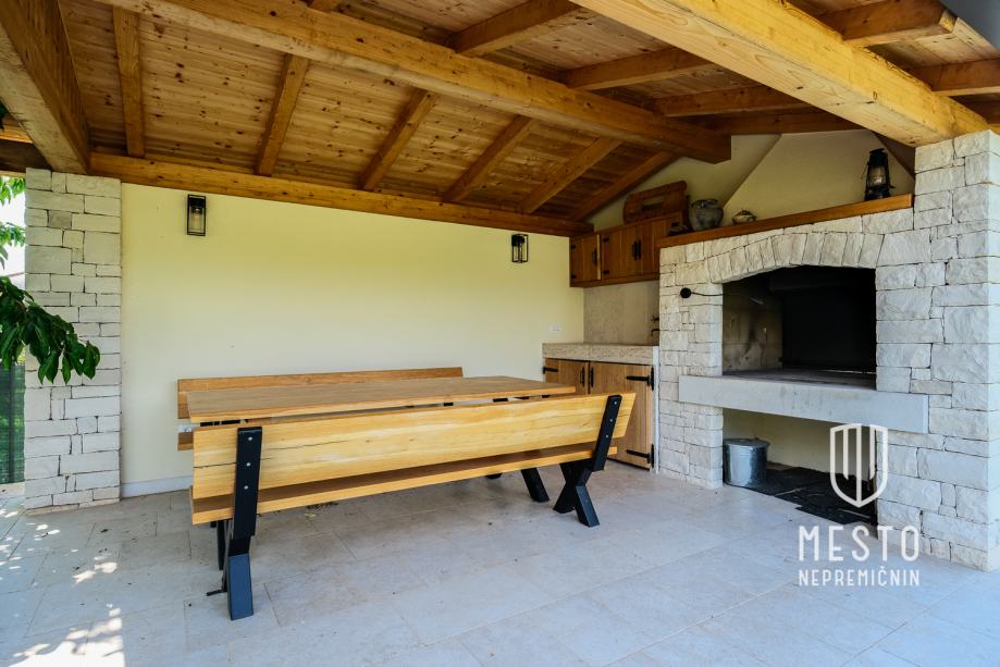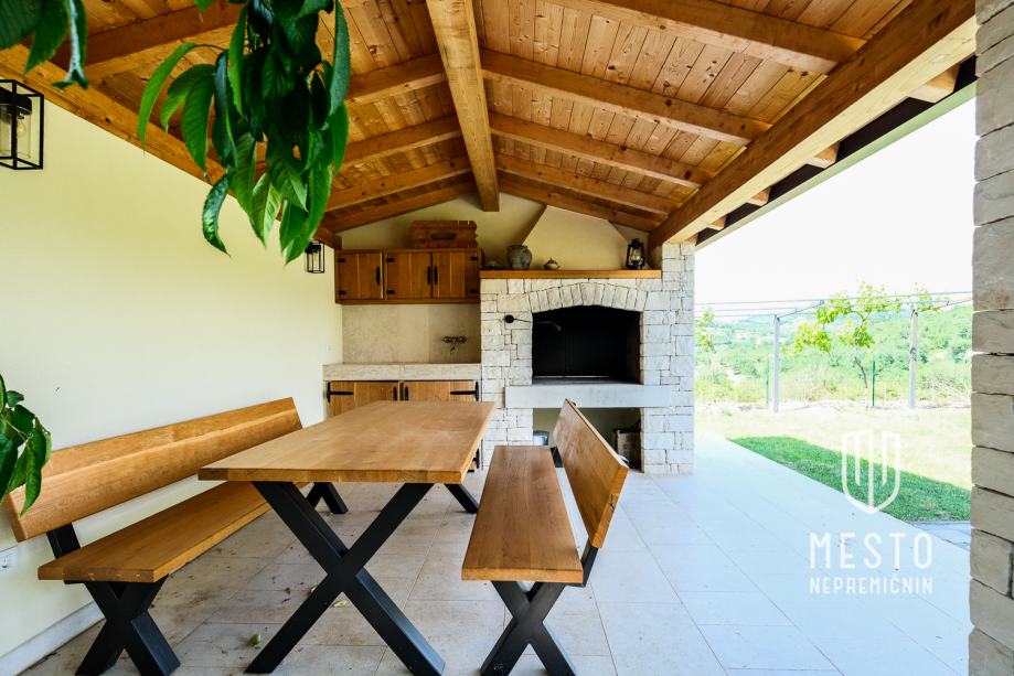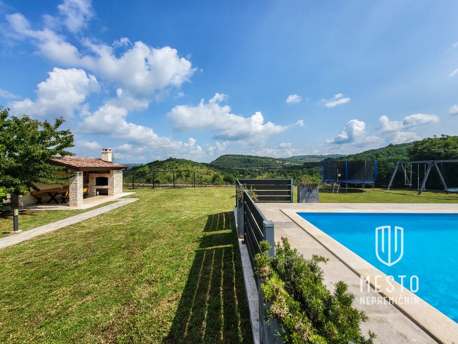 Vila je arhitektonski savršena, dizajnirana s obzirom na funkcionalnost, estetiku i kvalitetu života. Uključuje otvoreni i svijetli dnevni boravak s blagovaonicom i trpezarijom, iz kojih se otvara prekrasan pogled na okolna brda, potpuno opremljenu kuhinju, veliku terasu s pogledom, četiri prostrane spavaće sobe, tri moderne kupaonice, veliki podrum s kupaonicom i pomoćnom prostorijom, grijani bazen, ljetnu kuhinju s roštiljem i uređenim dvorištem te veliki vrt s dječjim kutkom.