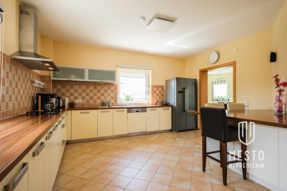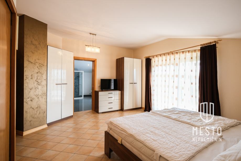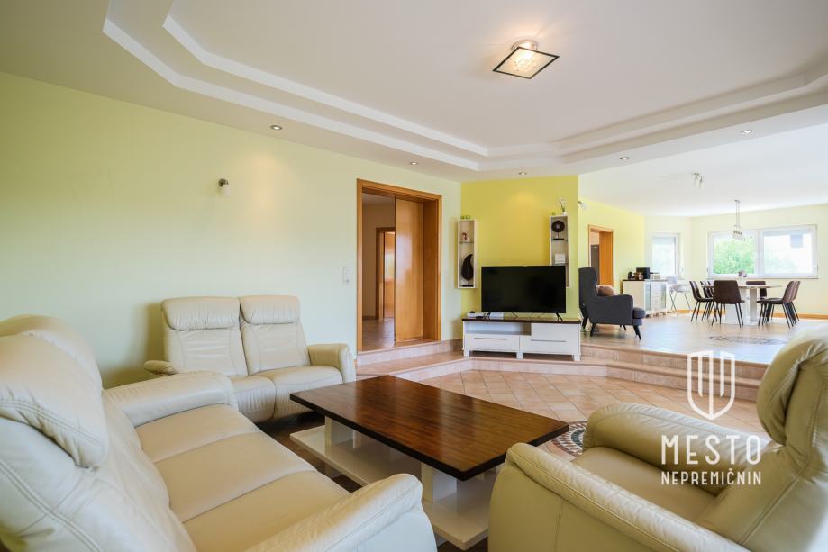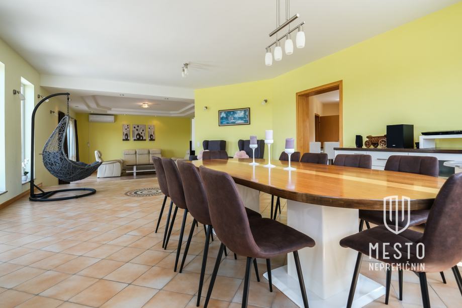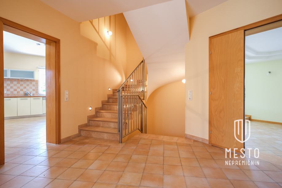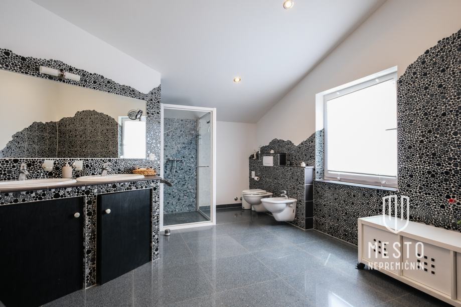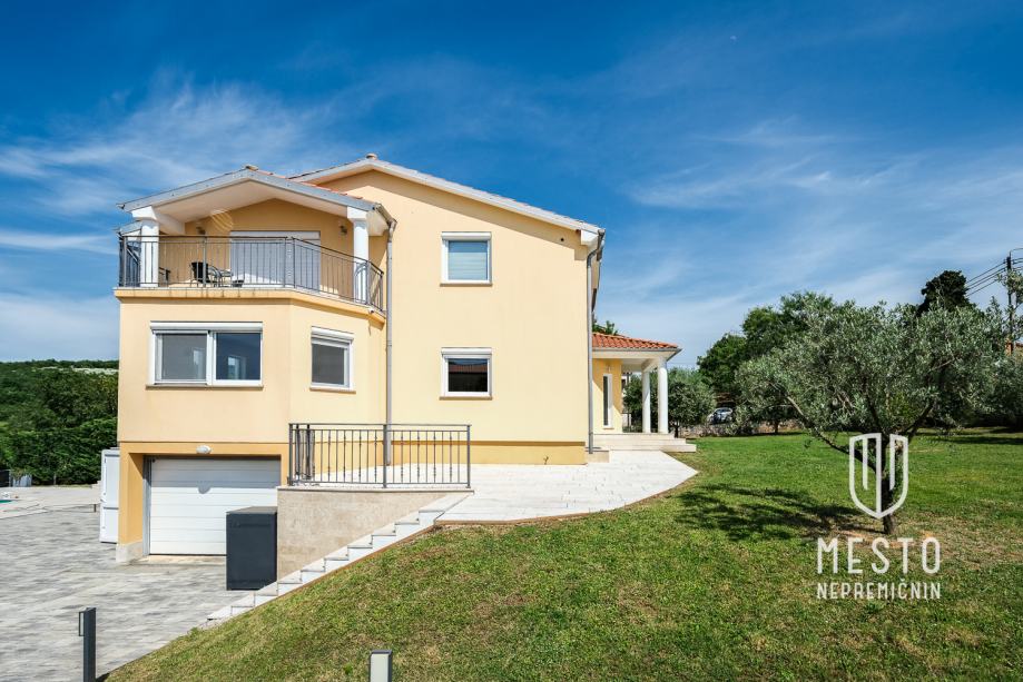 Vila je arhitektonski savršena, dizajnirana s obzirom na funkcionalnost, estetiku i kvalitetu života. Uključuje otvoreni i svijetli dnevni boravak s blagovaonicom i trpezarijom, iz kojih se otvara prekrasan pogled na okolna brda, potpuno opremljenu kuhinju, veliku terasu s pogledom, četiri prostrane spavaće sobe, tri moderne kupaonice, veliki podrum s kupaonicom i pomoćnom prostorijom, grijani bazen, ljetnu kuhinju s roštiljem i uređenim dvorištem te veliki vrt s dječjim kutkom.