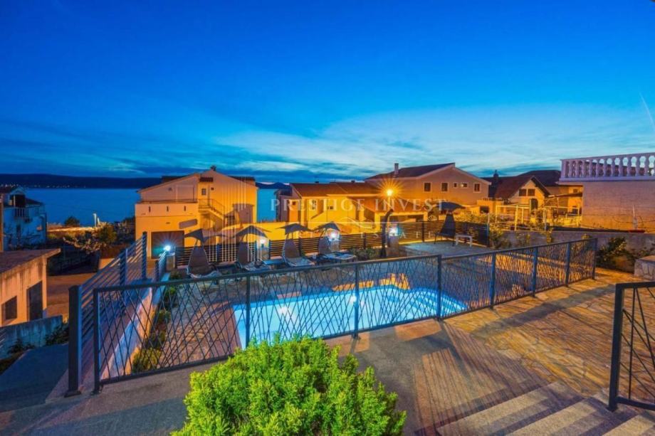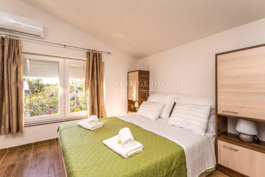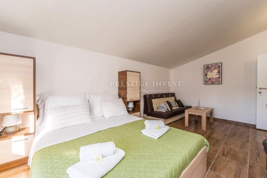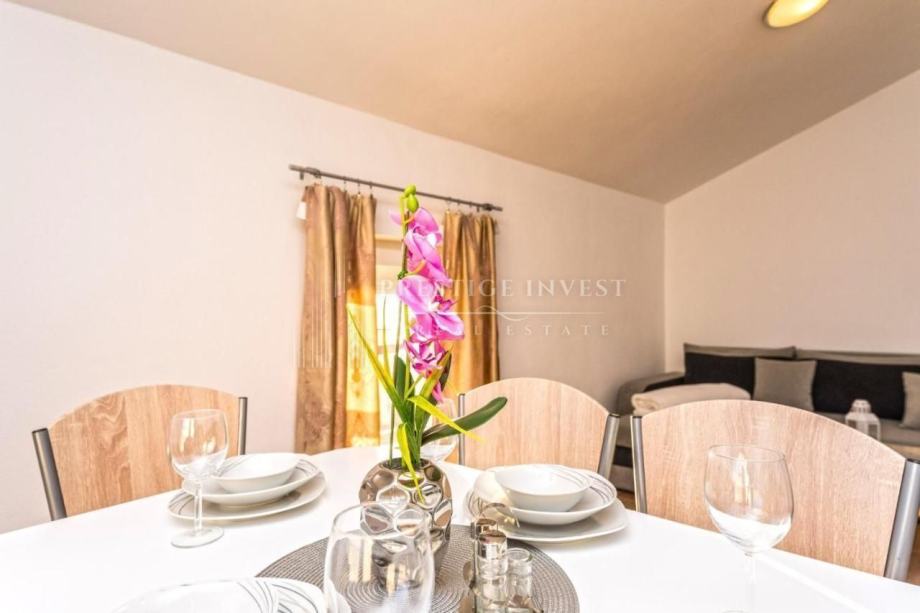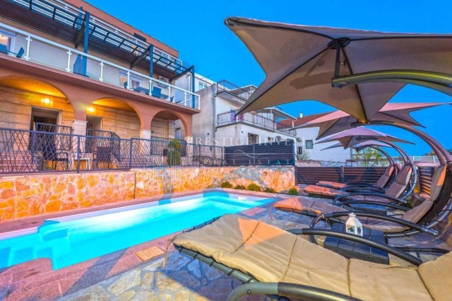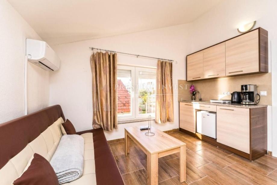 Nudi se na prodaju prekrasna apartmanska kuća smještena nedaleko od obale. Ova impozantna nekretnina sastoji se od 7 stambenih jedinica, od kojih su dva prostrana, dok su ostali apartmani manji po veličini. Cijela kuća nedavno je prošla temeljitu renovaciju, pružajući modernu udobnost uz zadržavanje autentičnog šarma.