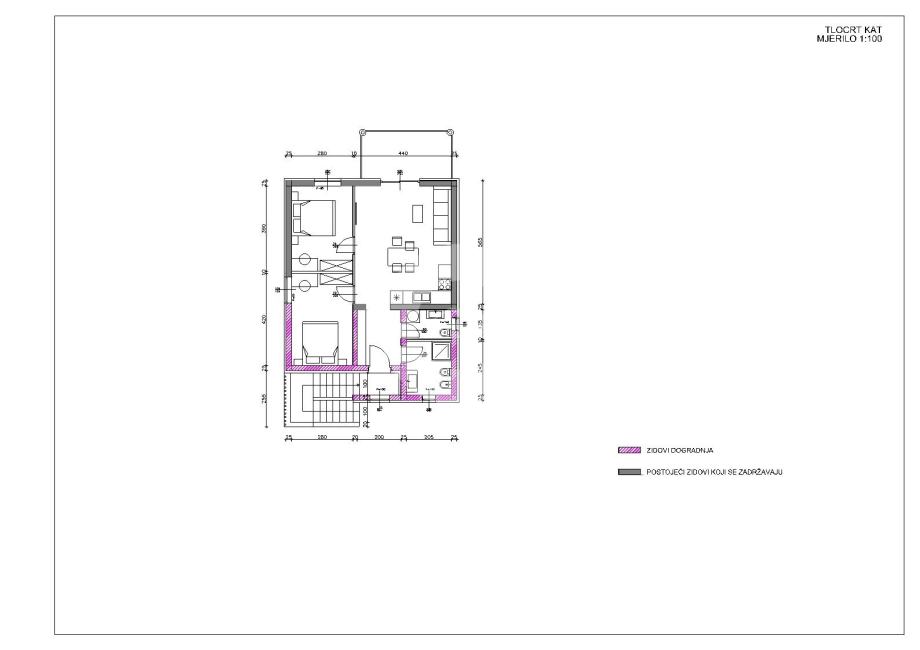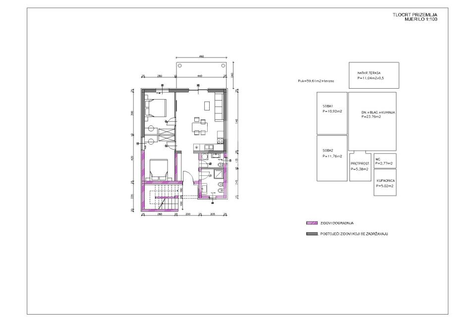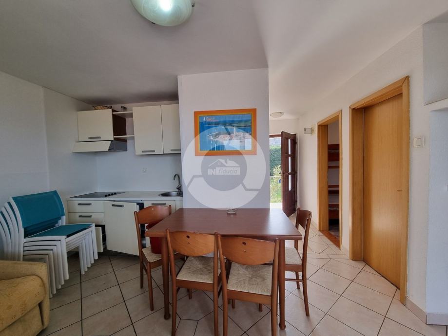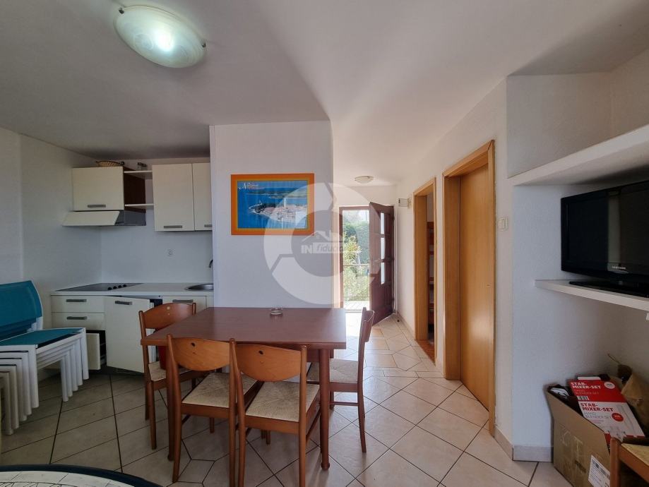 U prizemlju se nalazi stan od 59,61 m2 + terasa, sastoji se od hodnika, dvije spavaće sobe, kupaone, dnevnog boravka sa blagovaonom i kuhinjom. Iz dnevnog prostora se izlazi na prostranu natrkivenu terasu i vrt. Vanjskim stepenicama odlazi se u stan na katu iste kvadrature i rasporeda. Sa kata se iz spavaćih soba, dnevnog boravka i sa balkona pruža prekrasan pogled na more. Pristup uređenim plažama je jednostavan, svega na par minuta laganog hoda. Apartmanima treba manja rekonstrukcija ali su sasvim funkcionalni i ovako, izajmljuju se u turističke svrhe. Priključci na vodovodnu mrežu, strujnu mrežu i kanalizaciju su novi. Grijanje/hlađenje je regulirano klimatskom jedinicom. Asfaltni j eprilaz do kuće, ima javnu rasvjetu. Trgovina i restorani su u blizini. Idealan je izbor za one koji žele kuću na moru!!!