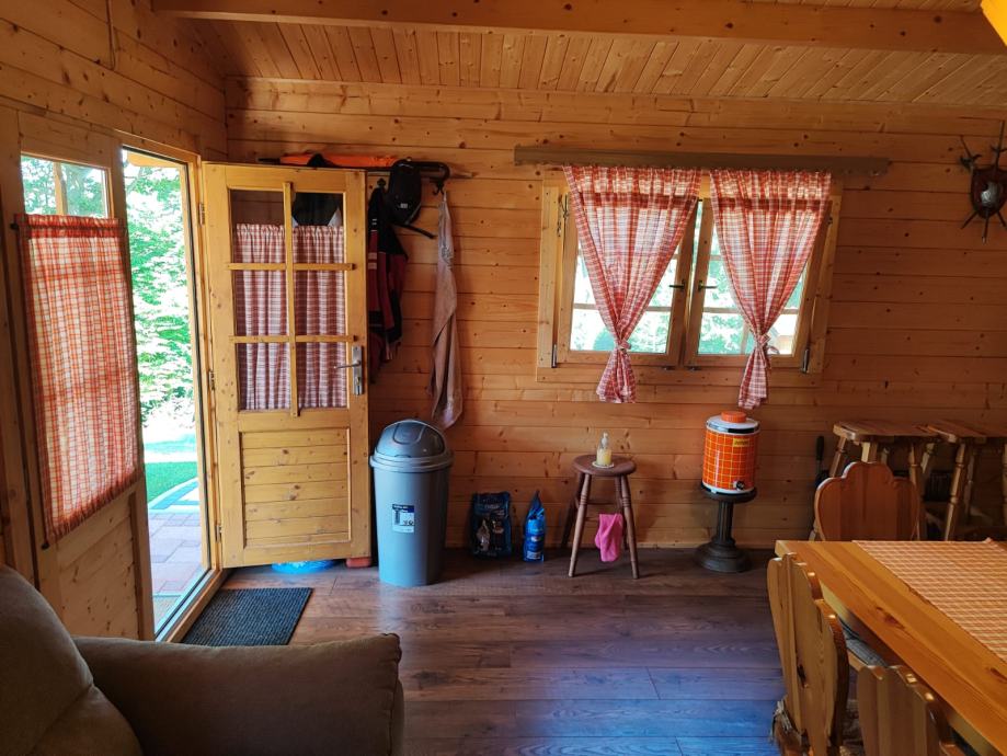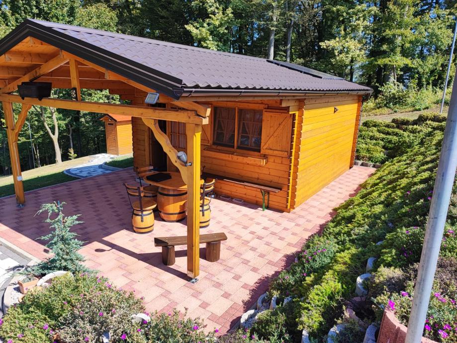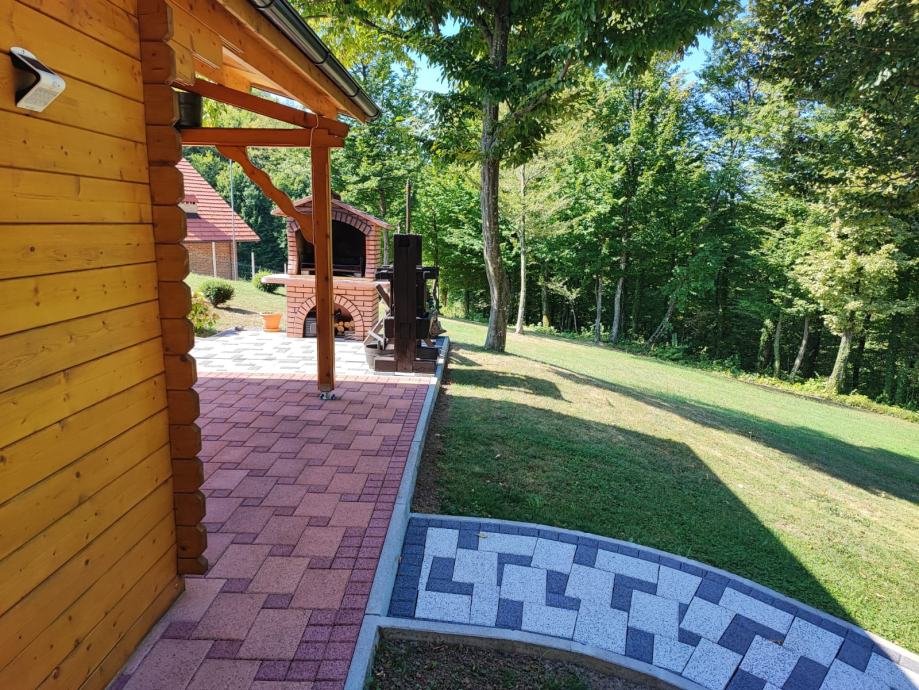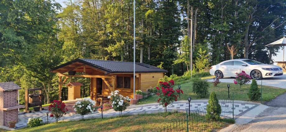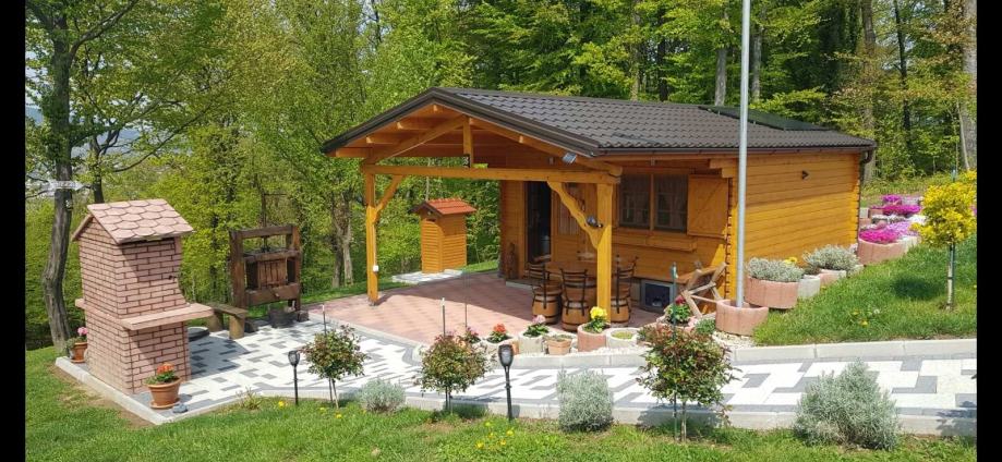 Prodaje se drvena vikend kuća sa natkrivenom terasom i prekrasnom okućnicom.