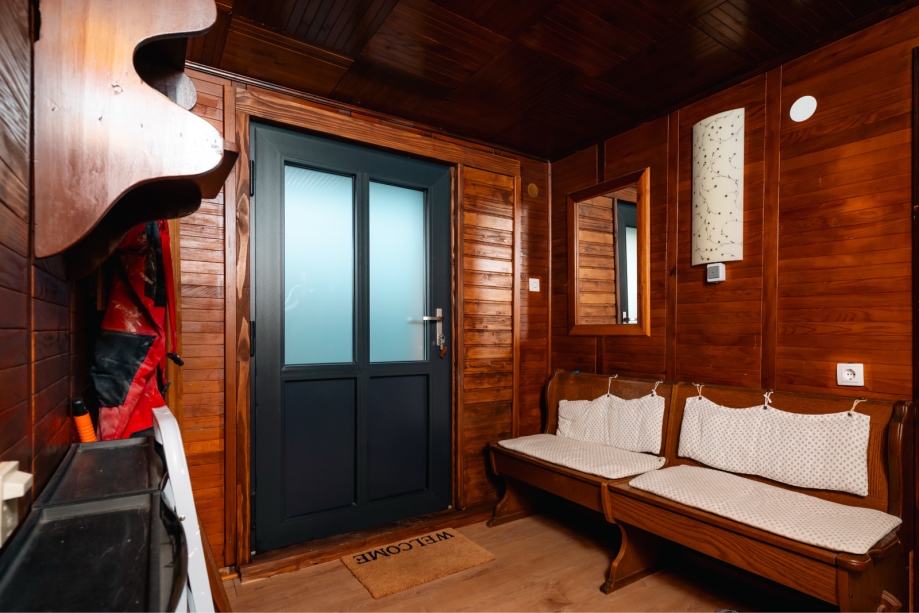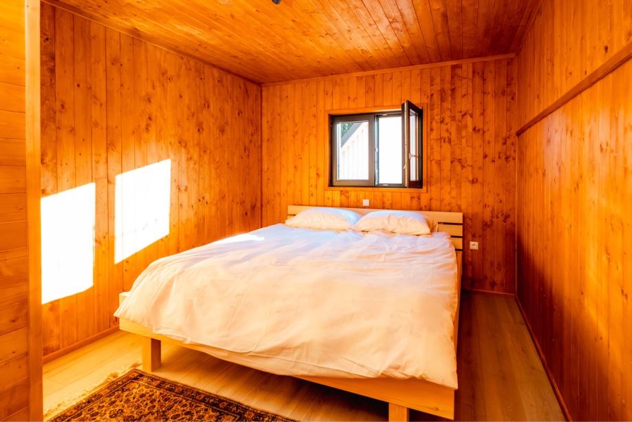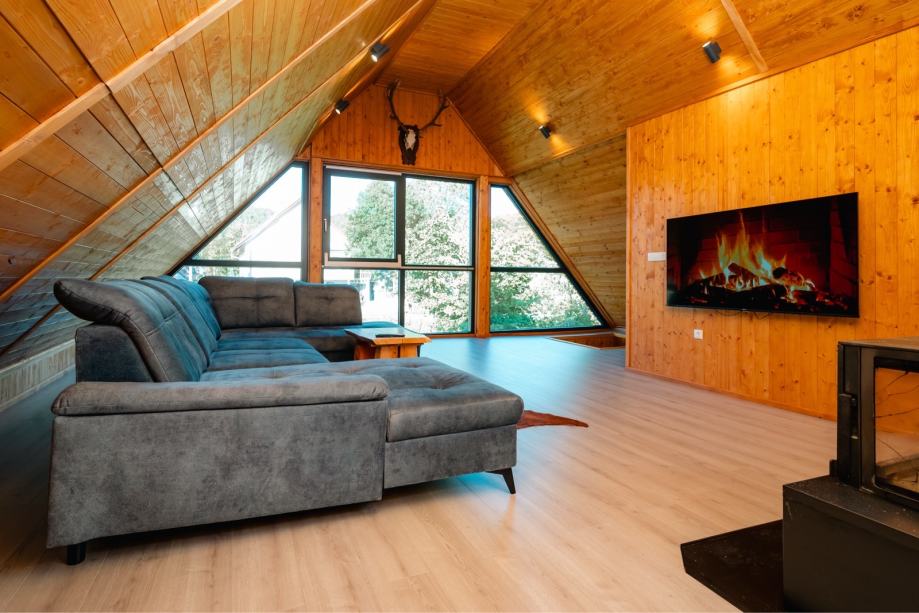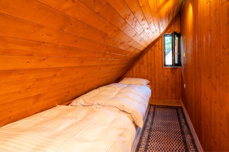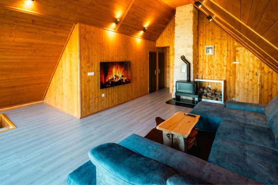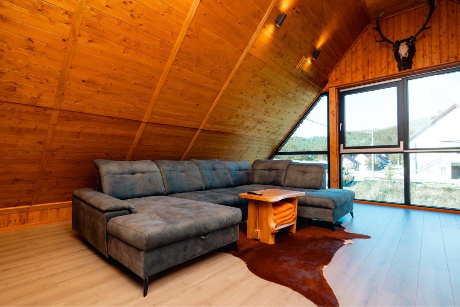 Kuća se ističe novom fasadom od drvenih oblica i modernom PVC stolarijom. U potkrovlju, koje je u potpunosti renovirano i uređeno s puno pažnje i stila, nalazi se prostrani dnevni boravak, tri udobne spavaće sobe te ugodna čitaonica za opuštanje. Na prvom katu smješten je još jedan dnevni boravak, kuhinja s blagovaonicom te dvije komforne spavaće sobe.
