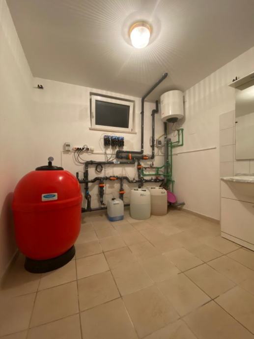 Prizemlje: drugo krilo zgrade je garaža, odvojeni prostor (cca 16m2)gdje je smješten bojler za centralno, garderobni ormari + jedna prostorija 5 x1 met. Strojarnica za BAZEN (koji se nalazi iznad svega toga) + prostorija cca 30m2 društveno zbivanje ili se može napraviti manji wellness centar ili teretana.