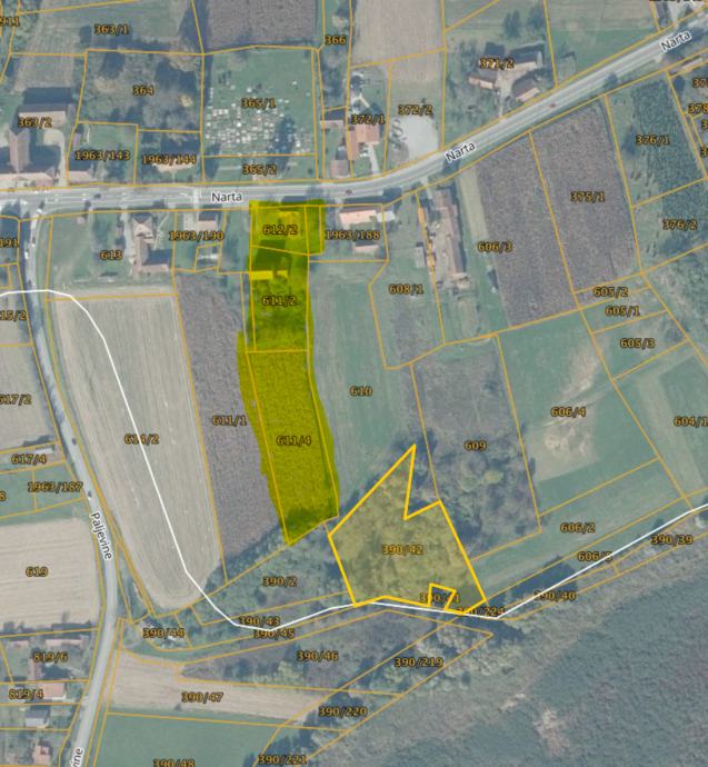 Predmet prodaje su dva stara objekta građena prije 1968. g. i zemljište u Narti, objekti su legalni imaju Uporabnu dozvolu, smješteni uz glavnu cestu, kuća ima priključak struje, prve dvije parcele su građevinske cca 2.600m2, ostalo je poljoprivredno zemljište.
