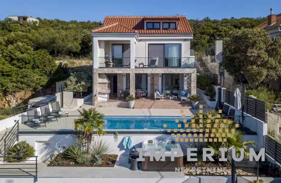 Vanjski prostor: Grijani bazen (34 m), jacuzzi, prostor za igru s trampolinom i stolnim tenisom, te uređeno dvorište s ograđenim parkirnim mjestima za tri automobila.