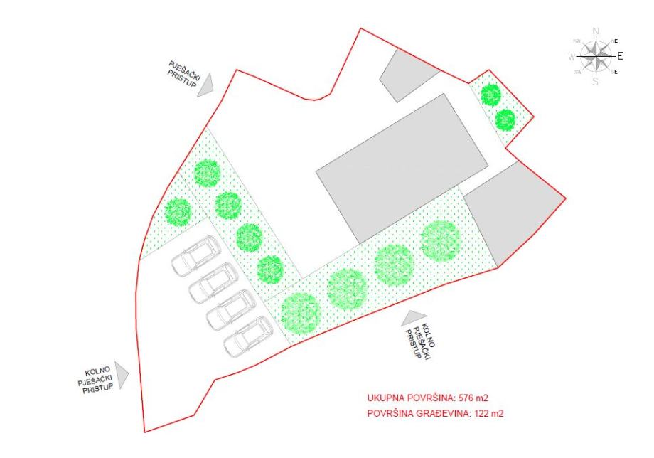 Tlocrtna površina objekata iznosi cca 122 m2, a nalaze se na građevinskoj parceli od 576 m2.
