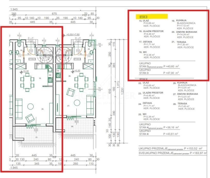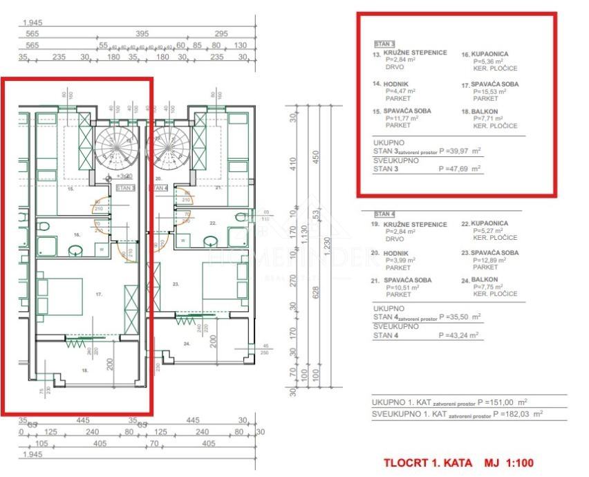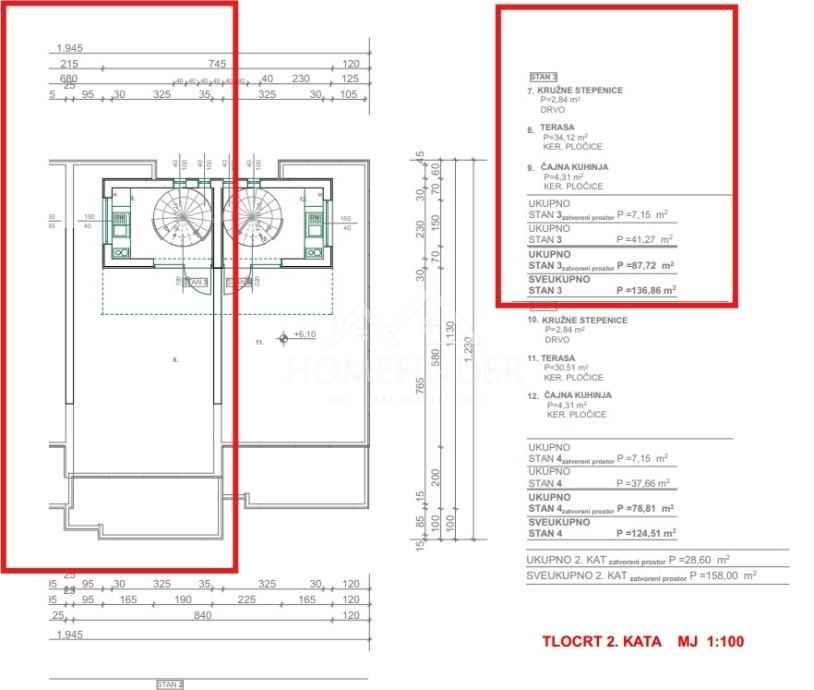 Ukupna neto korisna površina iznosi 107 m², od čega se 88 m² odnosi na unutarnji stambeni prostor, dok ostatak čine terasa u prizemlju, natkriveni balkon i prostrana krovna terasa od 35 m².