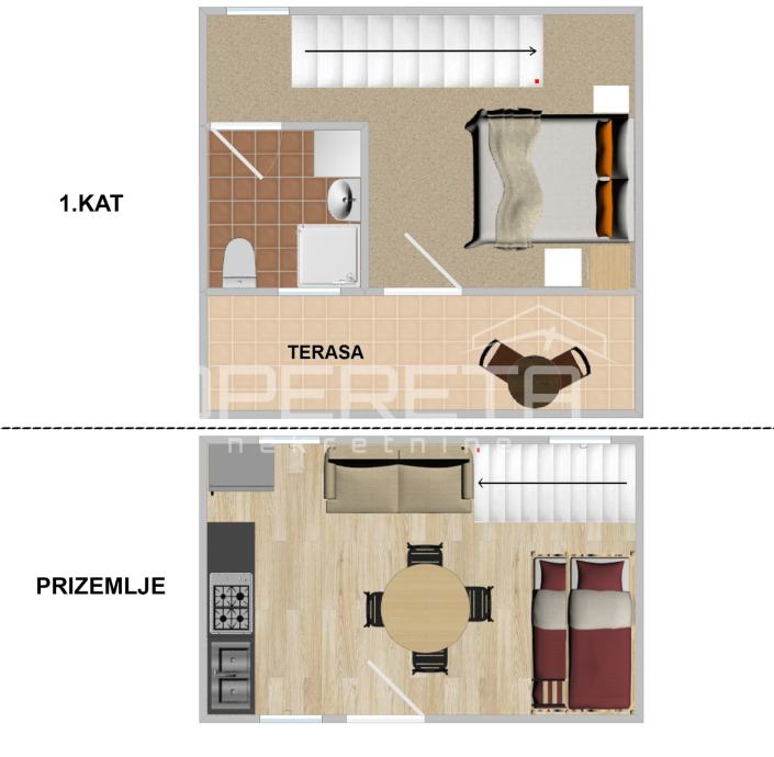 - Kat – spavaća soba, kupaonica i terasa
