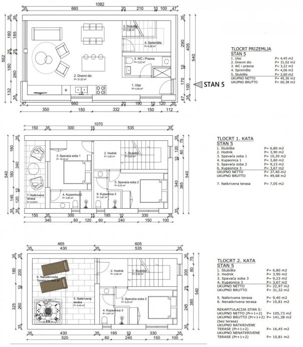 Kuća se trenutno nalazi u fazi izgradnje, imati će neto površinu od 105,73 m2 koji će biti raspoređenih na tri etaže.
