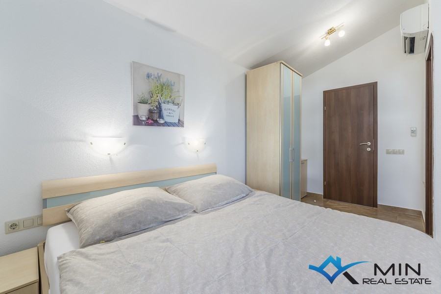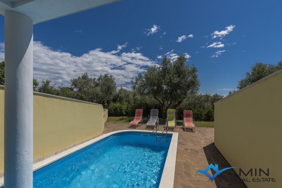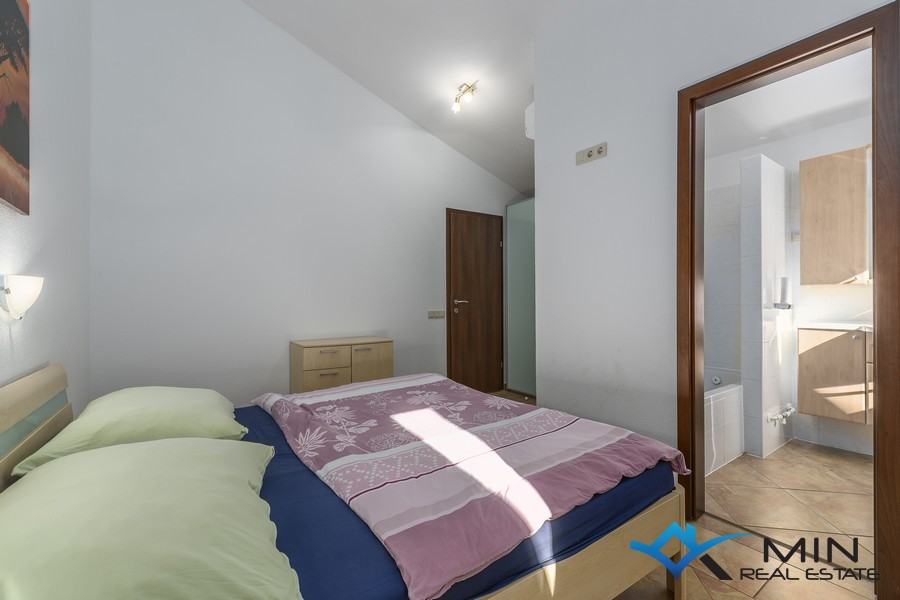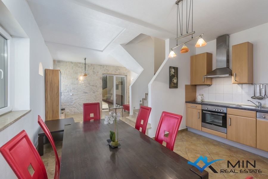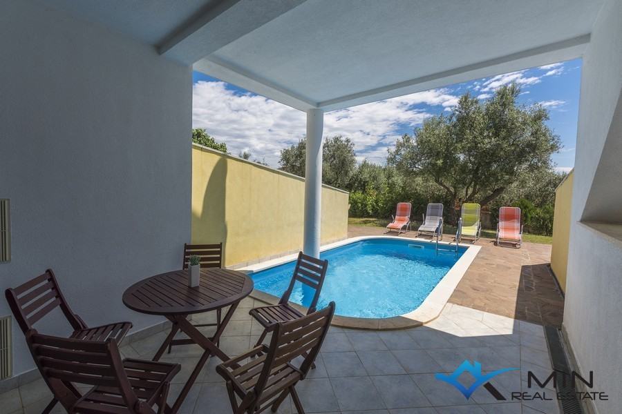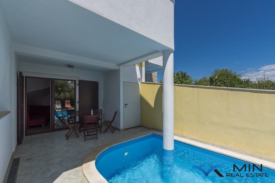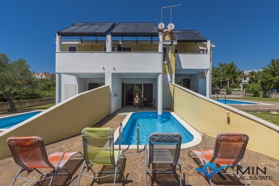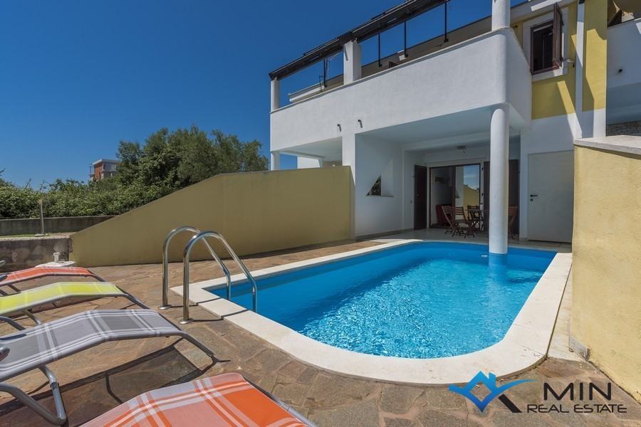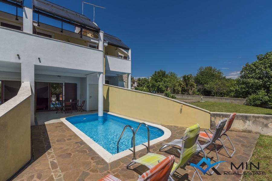 Prodaje se kuća u nizu s bazenom na mirnoj lokaciji udaljena 2, 5 km od mora i lijepo uređene plaže te centra grada. Kuća ima 112 m2 te se sastoji od prizemlja i prvog kata. U prizemlju se nalazi ulazni hodnik, kupatilo, kuhinja s blagovaonicom te dnevni boravak s izlazom na natkrivenu terasu i vrt. Vrt ima 152 m2 te se na njemu nalazi bazen. Na prvom katu nalazi se spavaća soba s privatnim kupatilom te izlazom na terasu s koje se pruža pogled na more. Kuća ima još 2 spavaće sobe koje su međusobno povezane te zajedničko kupatilo. Kuća ima mogućnost ugradnje kamina, a svaka prostorija u stanu opremljena je klima uređajem, dok je u dnevnom boravku podno grijanje. Kuća također ima solarne panele s kojima se grije topla voda u kući, podno grijanje te bazen. Kući pripadaju 2 parkirna mjesta. Kuća se iznajmljuje u turističke svrhe te ima jako dobru popunjenost u predsezoni, sezoni i post sezoni te se prodaje kompletno namještena. Kuću je moguće preuzeti ( ući u posjed ) u Oktobru, poslije turističke sezone