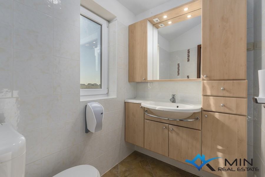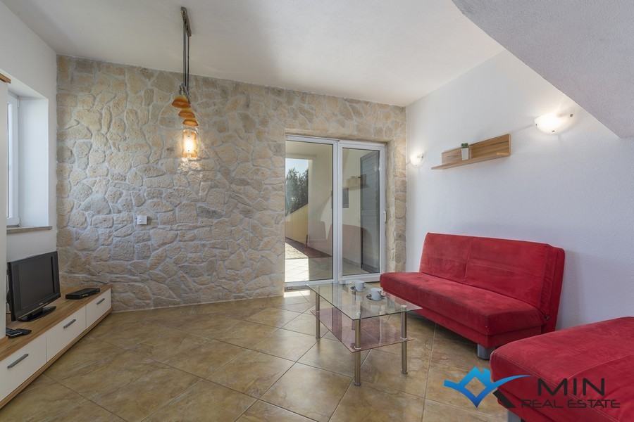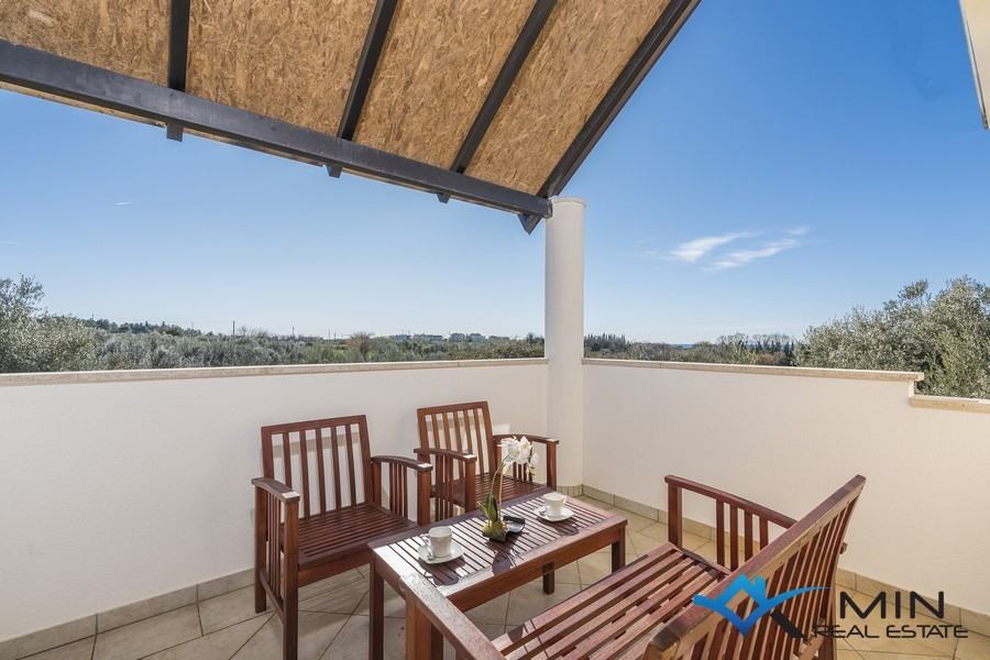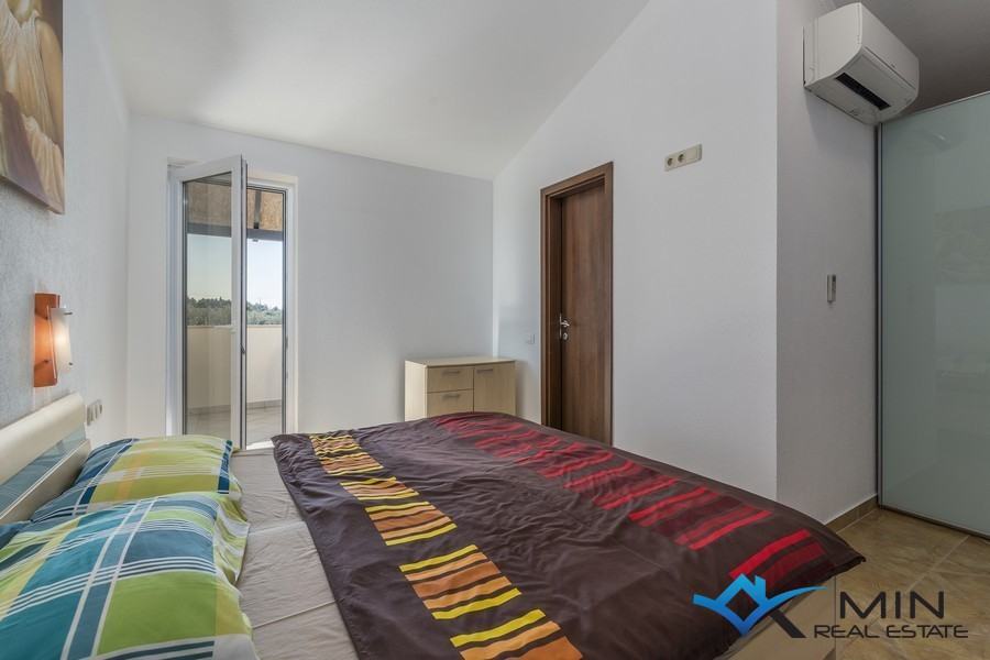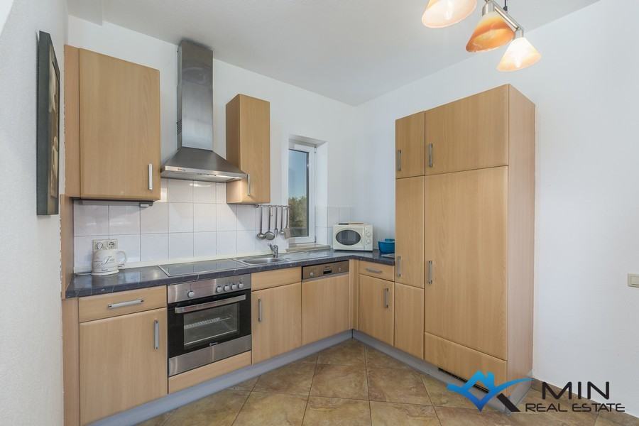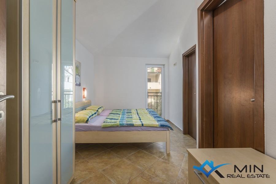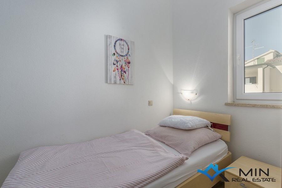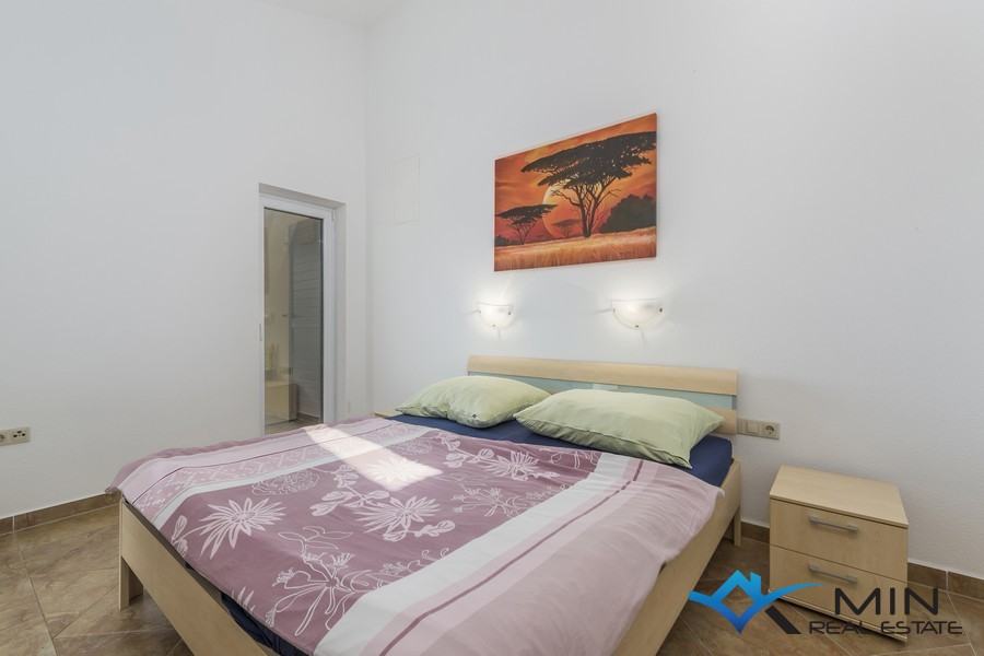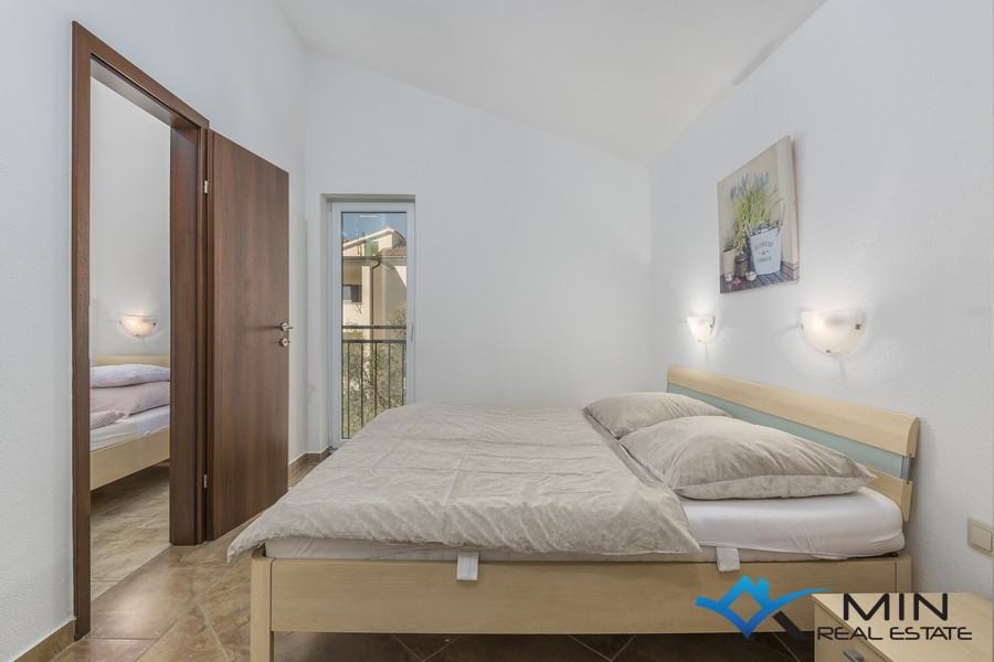 Prodaje se kuća u nizu s bazenom na mirnoj lokaciji udaljena 2, 5 km od mora i lijepo uređene plaže te centra grada. Kuća ima 112 m2 te se sastoji od prizemlja i prvog kata. U prizemlju se nalazi ulazni hodnik, kupatilo, kuhinja s blagovaonicom te dnevni boravak s izlazom na natkrivenu terasu i vrt. Vrt ima 152 m2 te se na njemu nalazi bazen. Na prvom katu nalazi se spavaća soba s privatnim kupatilom te izlazom na terasu s koje se pruža pogled na more. Kuća ima još 2 spavaće sobe koje su međusobno povezane te zajedničko kupatilo. Kuća ima mogućnost ugradnje kamina, a svaka prostorija u stanu opremljena je klima uređajem, dok je u dnevnom boravku podno grijanje. Kuća također ima solarne panele s kojima se grije topla voda u kući, podno grijanje te bazen. Kući pripadaju 2 parkirna mjesta. Kuća se iznajmljuje u turističke svrhe te ima jako dobru popunjenost u predsezoni, sezoni i post sezoni te se prodaje kompletno namještena. Kuću je moguće preuzeti ( ući u posjed ) u Oktobru, poslije turističke sezone