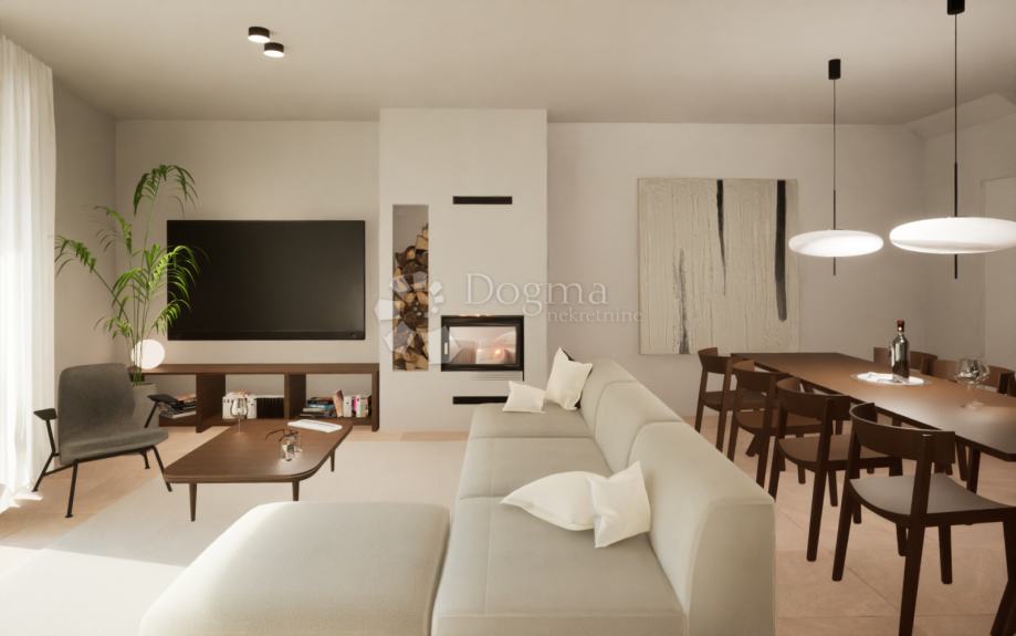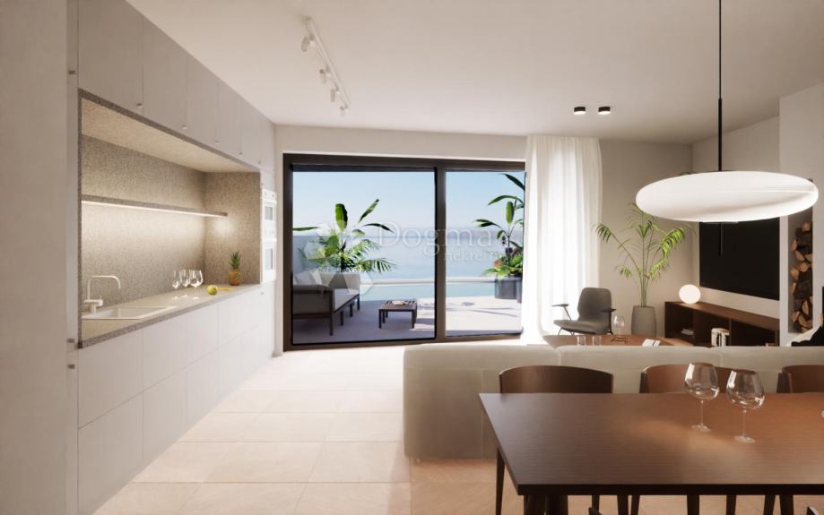 Veliki dnevni boravak povezan je kuhinjom i blagovaonicom, stvarajući otvoren prostor idealan za druženje i zabavu. Izlaz na prostranu terasu s bazenom omogućuje uživanje u prekrasnom pogledu na more i opuštajuće trenutke na otvorenom.