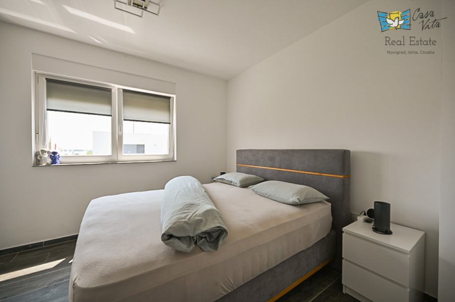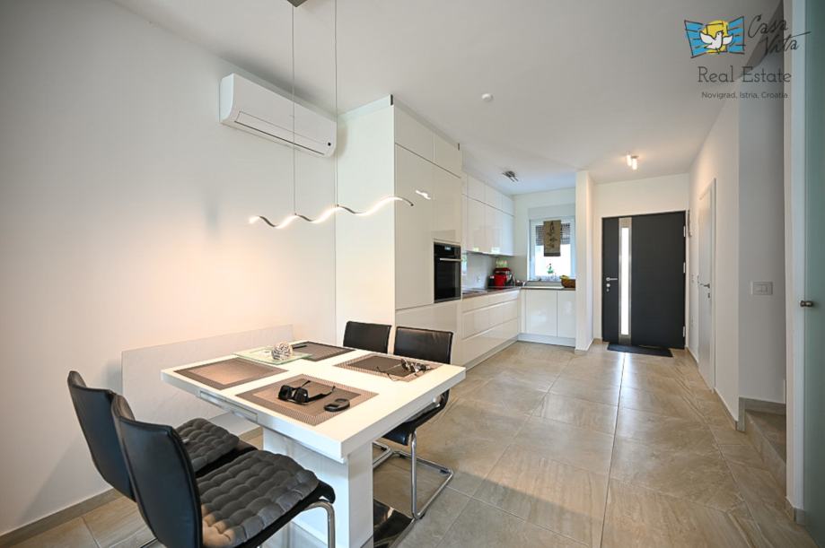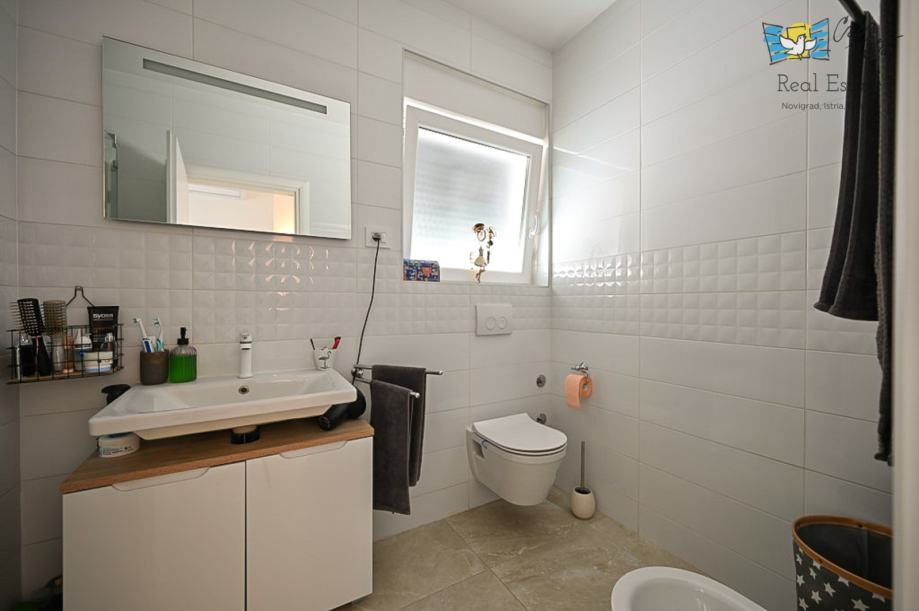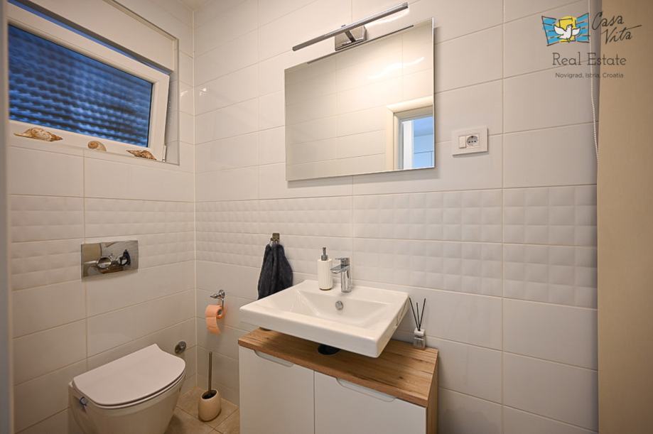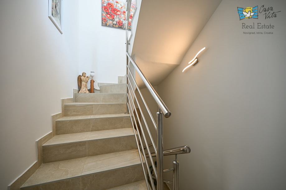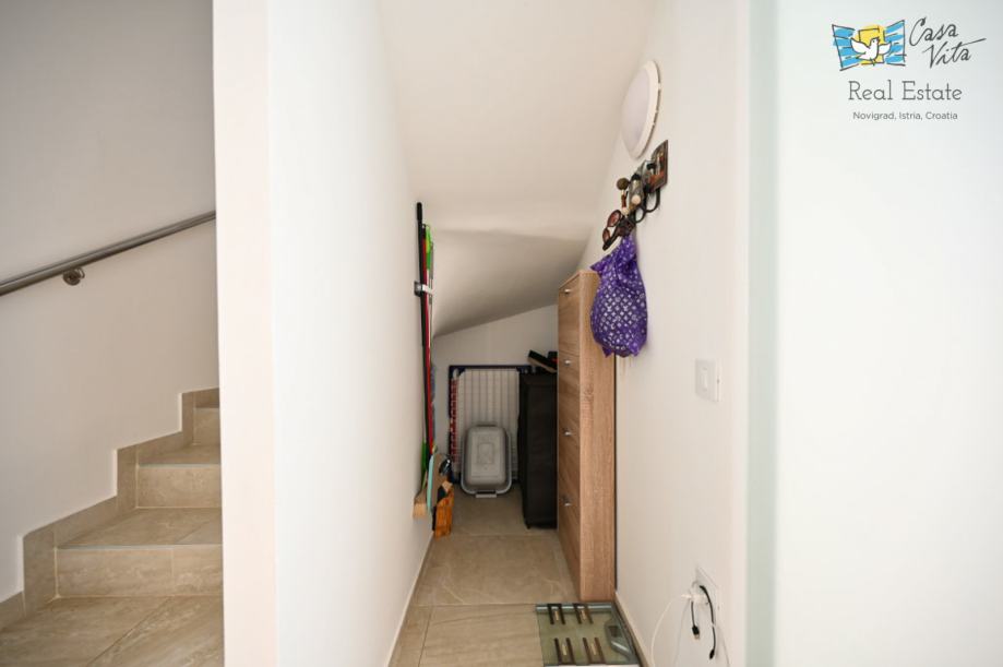 Na prvom katu nalaze se dvije spavaće sobe i kupaonica, unutarnje stepenice vode nas na krovnu terasu sa koje se pruža predivan pogled na grad Novigrad i more.