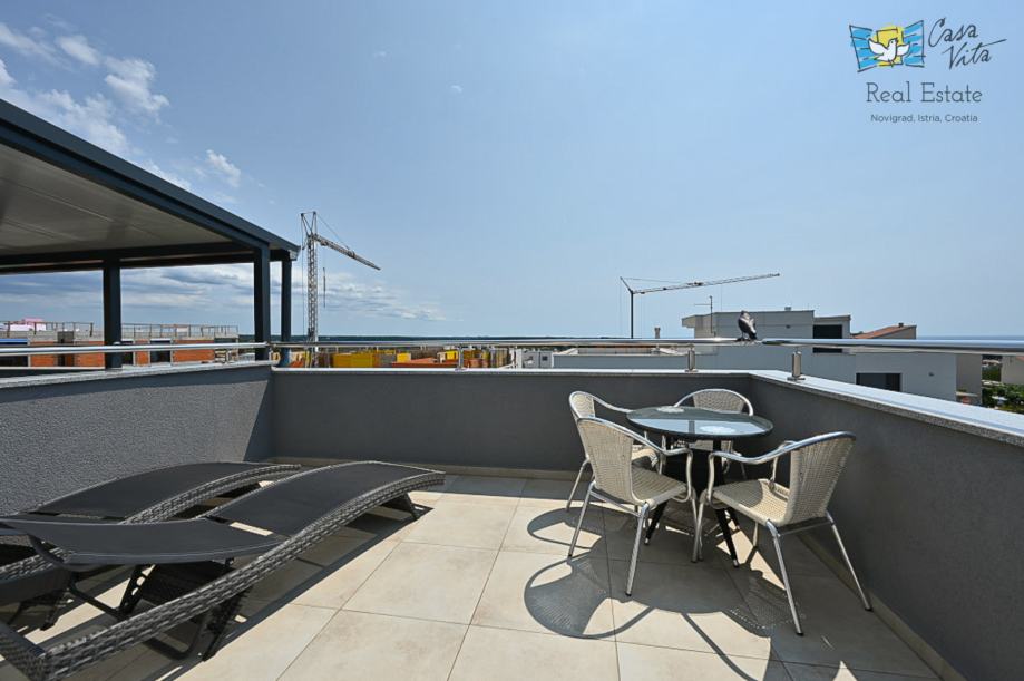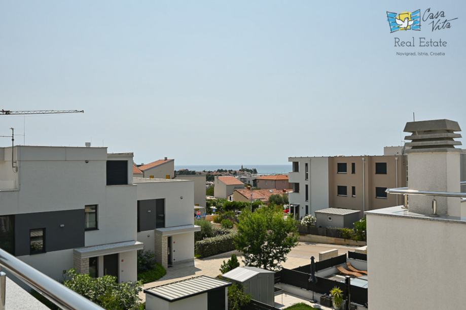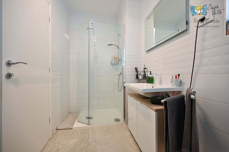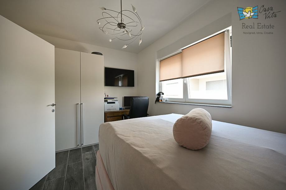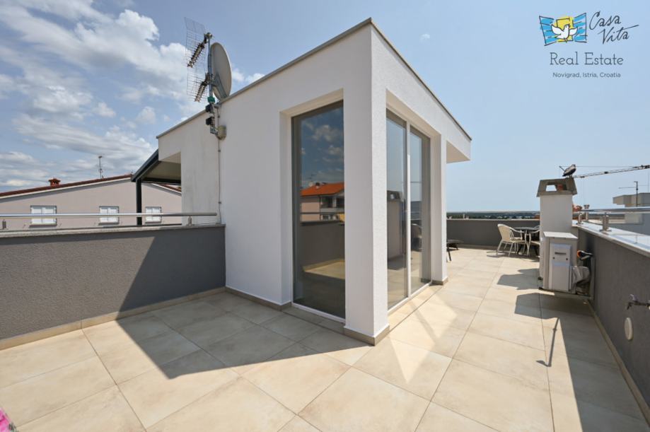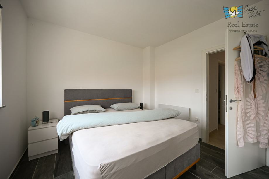 Na prvom katu nalaze se dvije spavaće sobe i kupaonica, unutarnje stepenice vode nas na krovnu terasu sa koje se pruža predivan pogled na grad Novigrad i more.