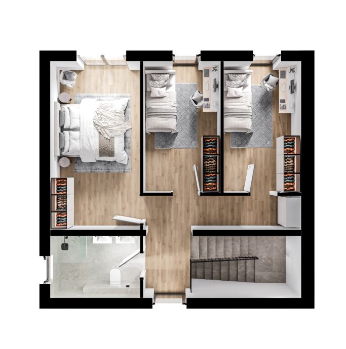 • Podovi u dnevnom boravku, spavaćim sobama i hodniku biti će obloženi oblogom (parket, vinil, keramika)