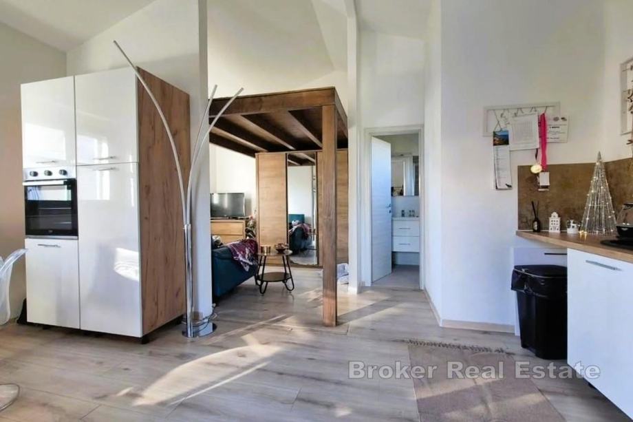Na katu se nalazi stan površine 35 m² koji se sastoji od dnevnog dijela s kuhinjom, spavaće sobe i kupaonice.