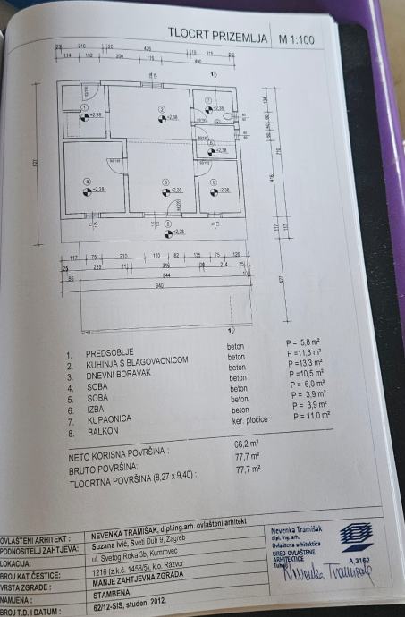 - I. kata/prizemlje (66,2m2 neto korisna površina) gdje se nalaze dvije spavaće sobe, prostor predviđen za kupaonicu, prostor predviđen za kuhinju sa blagovaonicom i veliki prostrani balkon s prekrasnim pogledom