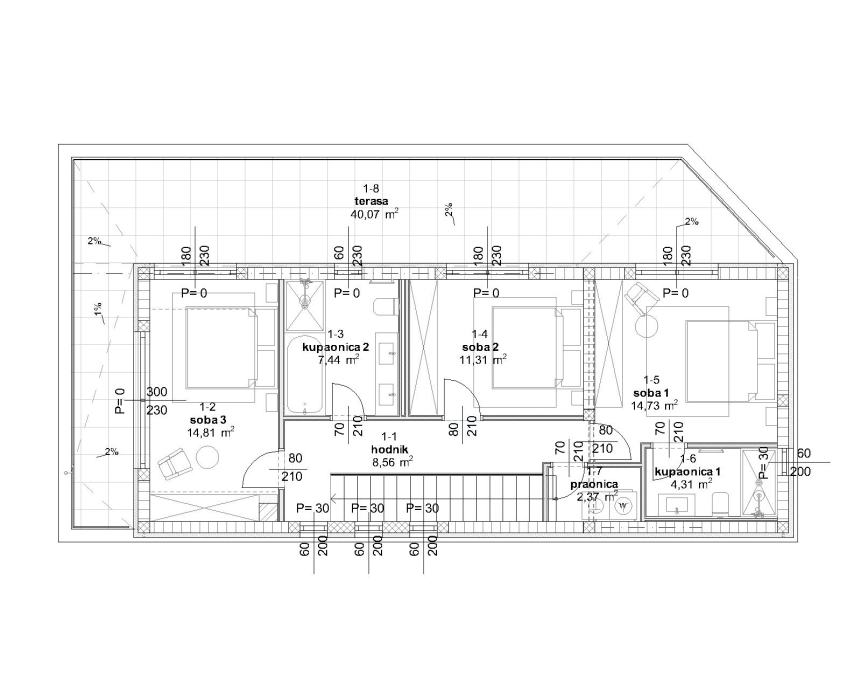 Na katu su smještene 3 spavaće sobe, od kojih "master room" s vlastitom kupaonicom i dvije sobe koje imaju zajedničku kupaonicu, na katu se još nalazi praonica. Sve sobe imaju izlaz na terasu s koje se pruža lijepi pogled na more.
