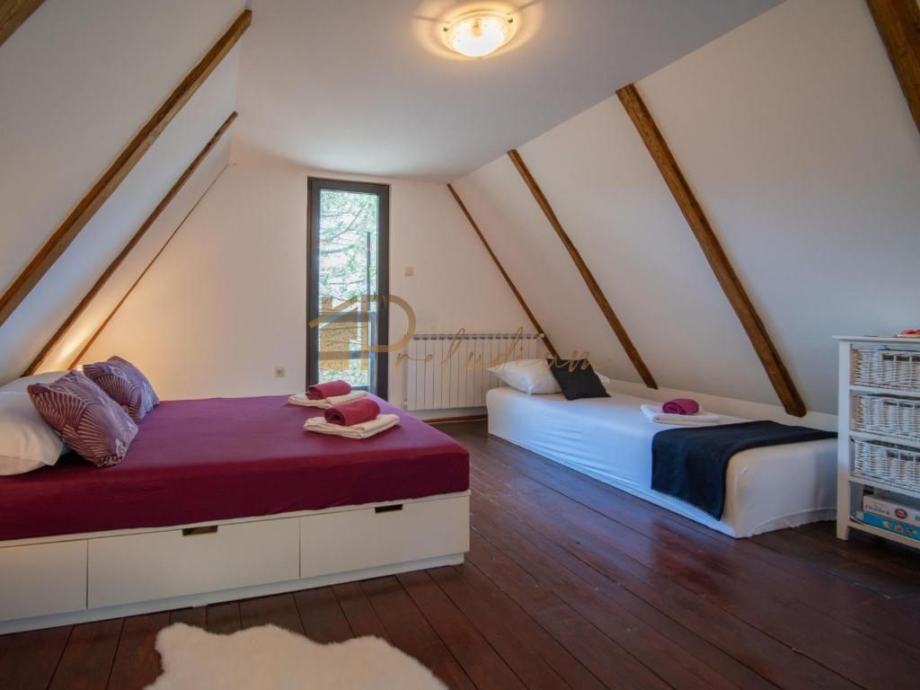 - Potkrovlje: spavaća soba s četiri ležaja i dvije terase – savršeno za buđenje uz pogled na prirodu