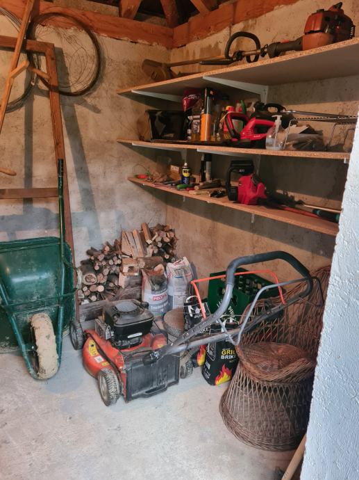 U cijenu vikendice uključen je sav namještaj, kao i alat za održavanje okoliša. Od alata izdvajam akumulatorske škare za živicu, akumulatorska lančana pila, samohodna kosilica i trimer. Na terasi je novi stol od masivnog drveta i nova pečenjara.