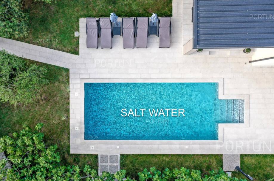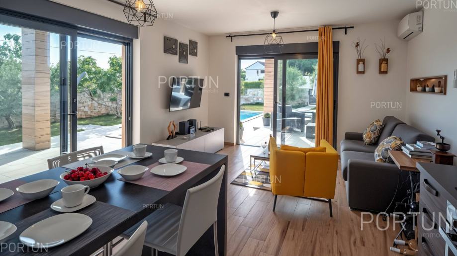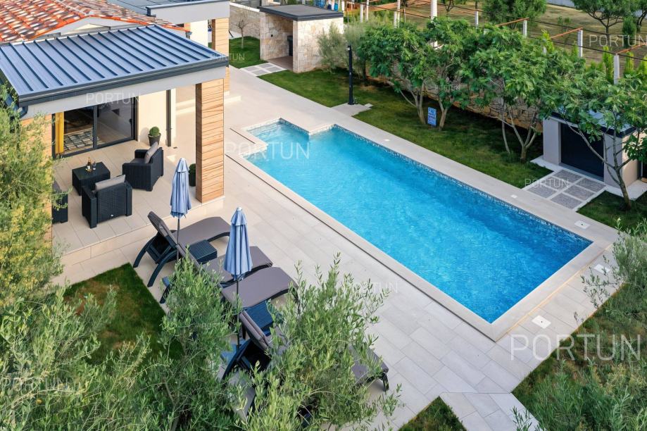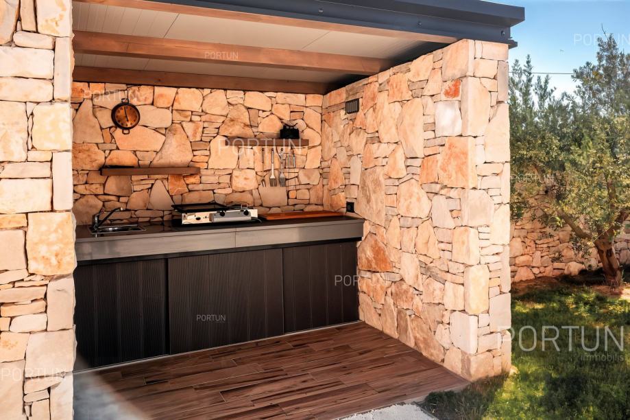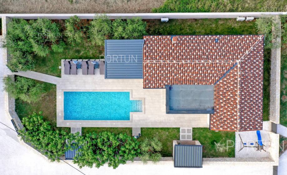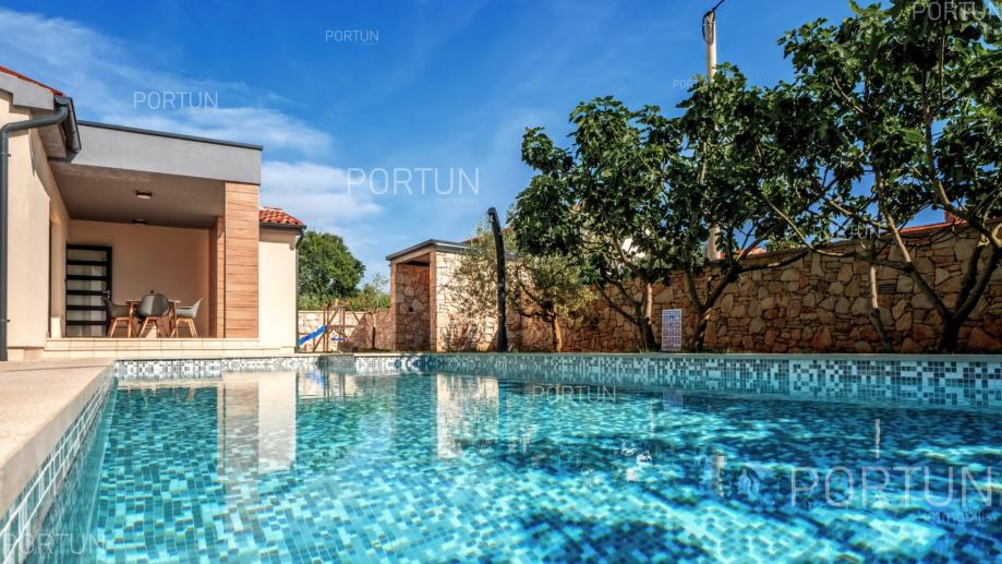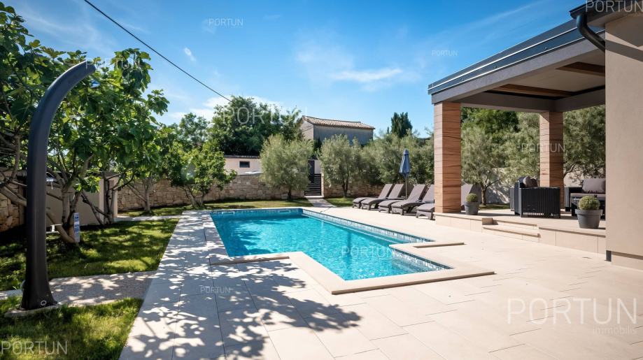U mirnom selu na istočnoj obali Istre, svega nekoliko minuta vožnje od mora i 17 km od Pule, prodaje se udobna prizemnica idealna za odmor. Kuća s dvije spavaće sobe i privatnim bazenom nudi savršenu kombinaciju opuštanja i udobnosti, u zelenilu i potpunom miru.Prizemnica izgrađena 2018. godine nudi optimalan raspored prostora na površini od cca. 90 četvornih metara. Sastoji se od dnevnog boravka s kuhinjom i blagovaonicom, dvije spavaće sobe, od kojih jedna ima vlastitu kupaonicu, još jedne kupaonice, hodnika, ostave te dvije natkrivene terase. Cijeli prostor je klimatiziran s tri uređaja, a kuća posjeduje energetski certifikat A.Posebna prednost ove kuće je uređeno dvorište s skimerskim bazenom površine 30,00 m2. Bazen je betonske konstrukcije, obložen mozaik pločicama i koristi slanu vodu s elektrolizom. Voda se može grijati putem dizalice topline, a uz bazen se nalazi sunčalište popločano pločicama, ležaljkama, suncobranima i solarnim tušem.Eksterijer kuće uključuje uređene zelene površine, travnjak s automatskim navodnjavanjem te zasađene masline i smokve. Parcela je ograđena kamenim zidom što dodatno pridonosi osjećaju privatnosti. Kuća je orijentirana na jugozapad, što omogućuje obilje prirodne svjetlosti tijekom dana.Kuća je potpuno opremljena – sve što vidite uključeno je u cijenu. Ugrađena je kvalitetna stolarija: aluminijska balkonska vrata, PVC prozori, sigurnosna ulazna vrata, te motorizirane rolete. Podovi su obloženi keramičkim pločicama koje pružaju jednostavno održavanje i osjećaj prostranosti.Lokacija je iznimno praktična: more i plaže udaljeni su 3,5 km, dok se u krugu od 5 km nalaze svi važni sadržaji – trgovina, kafići, restorani, škola, vrtić, ljekarna i dom zdravlja. U blizini su i sportski tereni te poznati adrenalinski park Glavani. Grad Pula udaljen je samo 17 km, a do autoceste i zračne luke stiže se za 15 minuta.Za više informacija ili dogovor oko razgleda, slobodno nam se javite. Rado ćemo odgovoriti na sva vaša pitanja!KLJUČNE OSOBINE✔ 2 Spavaće sobe | 2 Kupaonice✔ Grijani bazen sa slanom vodom ✔ Sunčalište okruženo zelenilom idealno za uživanje u ljetu✔ Kategorizacija: 4 Zvjezdice. ✔ Sav namještaj je uključen u cijeni✔ Plaža 3,5 km