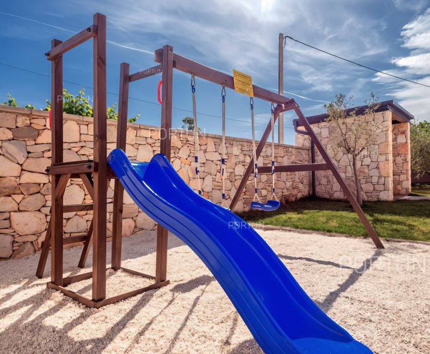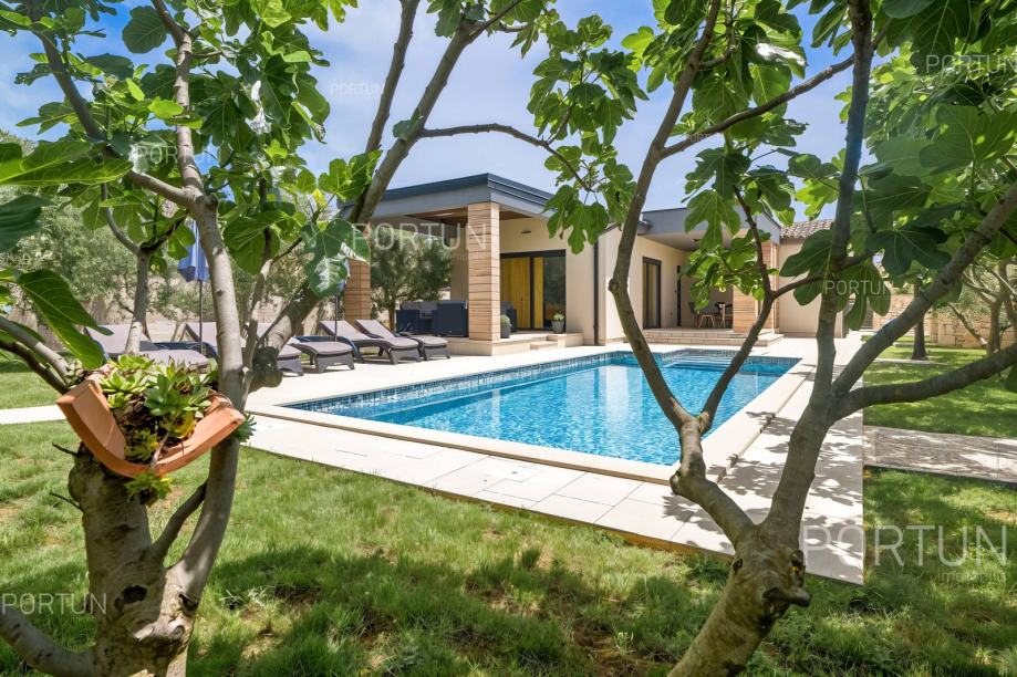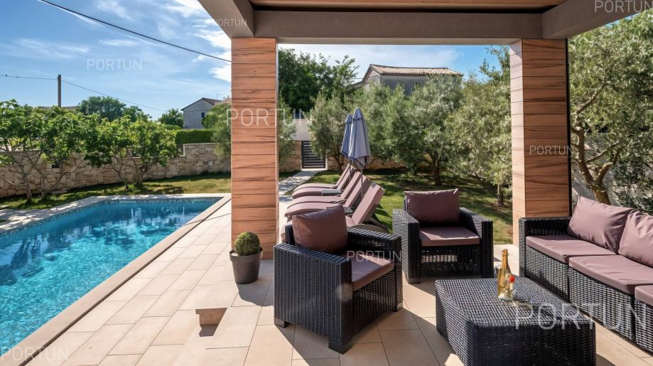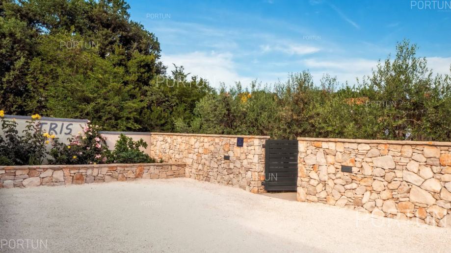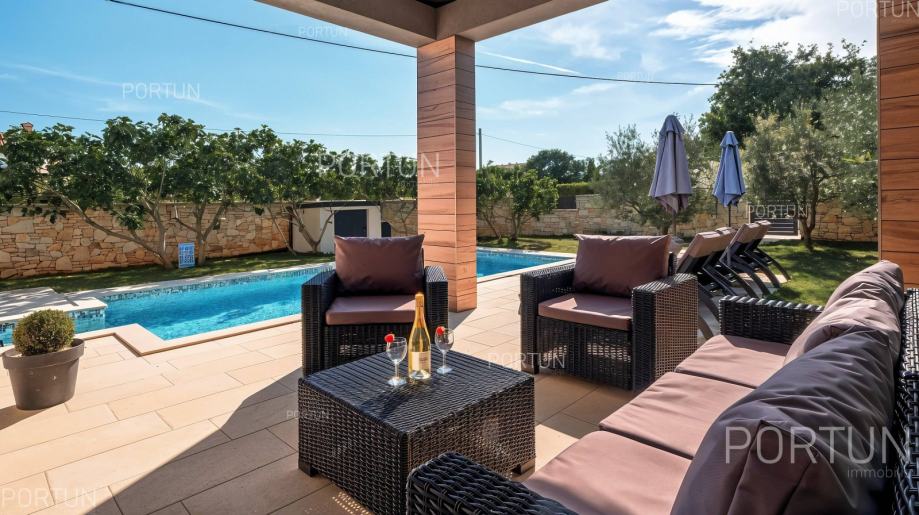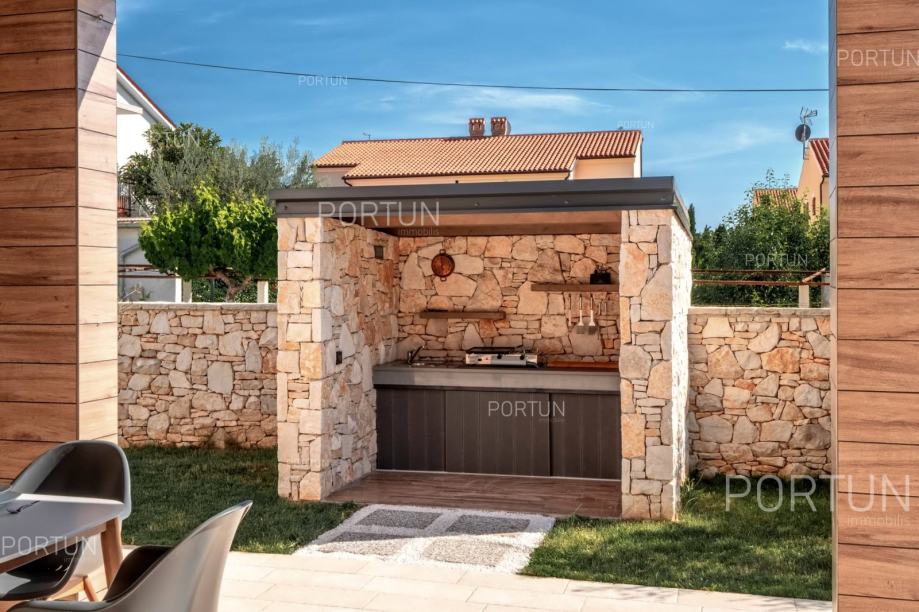 U mirnom selu na istočnoj obali Istre, svega nekoliko minuta vožnje od mora i 17 km od Pule, prodaje se udobna prizemnica idealna za odmor. Kuća s dvije spavaće sobe i privatnim bazenom nudi savršenu kombinaciju opuštanja i udobnosti, u zelenilu i potpunom miru.Prizemnica izgrađena 2018. godine nudi optimalan raspored prostora na površini od cca. 90 četvornih metara. Sastoji se od dnevnog boravka s kuhinjom i blagovaonicom, dvije spavaće sobe, od kojih jedna ima vlastitu kupaonicu, još jedne kupaonice, hodnika, ostave te dvije natkrivene terase. Cijeli prostor je klimatiziran s tri uređaja, a kuća posjeduje energetski certifikat A.Posebna prednost ove kuće je uređeno dvorište s skimerskim bazenom površine 30,00 m2. Bazen je betonske konstrukcije, obložen mozaik pločicama i koristi slanu vodu s elektrolizom. Voda se može grijati putem dizalice topline, a uz bazen se nalazi sunčalište popločano pločicama, ležaljkama, suncobranima i solarnim tušem.Eksterijer kuće uključuje uređene zelene površine, travnjak s automatskim navodnjavanjem te zasađene masline i smokve. Parcela je ograđena kamenim zidom što dodatno pridonosi osjećaju privatnosti. Kuća je orijentirana na jugozapad, što omogućuje obilje prirodne svjetlosti tijekom dana.Kuća je potpuno opremljena – sve što vidite uključeno je u cijenu. Ugrađena je kvalitetna stolarija: aluminijska balkonska vrata, PVC prozori, sigurnosna ulazna vrata, te motorizirane rolete. Podovi su obloženi keramičkim pločicama koje pružaju jednostavno održavanje i osjećaj prostranosti.Lokacija je iznimno praktična: more i plaže udaljeni su 3,5 km, dok se u krugu od 5 km nalaze svi važni sadržaji – trgovina, kafići, restorani, škola, vrtić, ljekarna i dom zdravlja. U blizini su i sportski tereni te poznati adrenalinski park Glavani. Grad Pula udaljen je samo 17 km, a do autoceste i zračne luke stiže se za 15 minuta.Za više informacija ili dogovor oko razgleda, slobodno nam se javite. Rado ćemo odgovoriti na sva vaša pitanja!KLJUČNE OSOBINE✔ 2 Spavaće sobe | 2 Kupaonice✔ Grijani bazen sa slanom vodom ✔ Sunčalište okruženo zelenilom idealno za uživanje u ljetu✔ Kategorizacija: 4 Zvjezdice. ✔ Sav namještaj je uključen u cijeni✔ Plaža 3,5 km